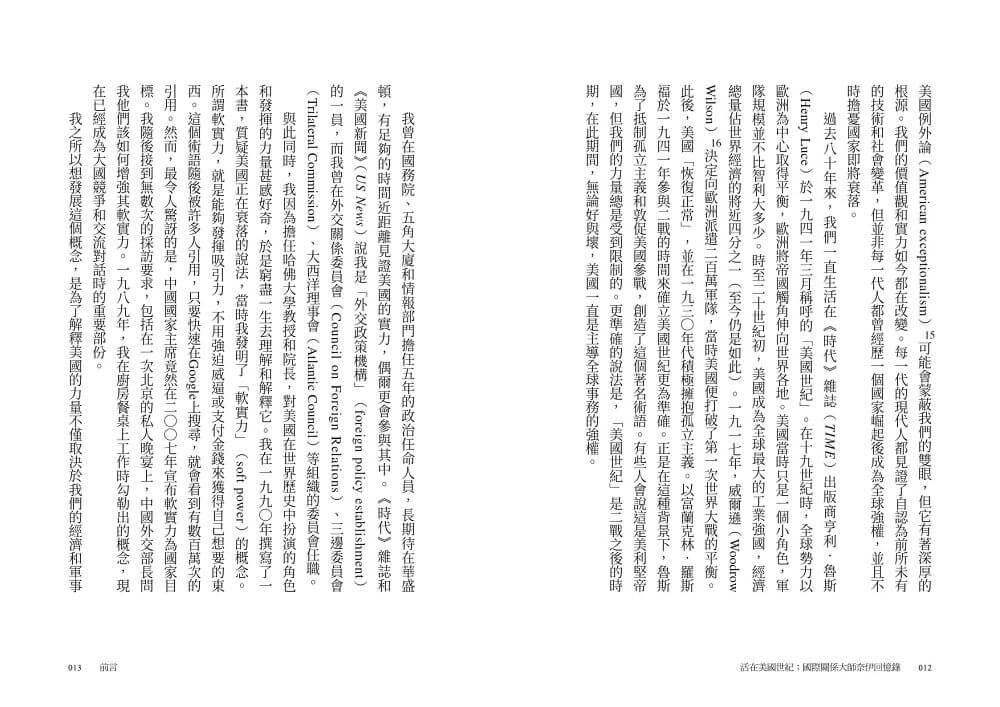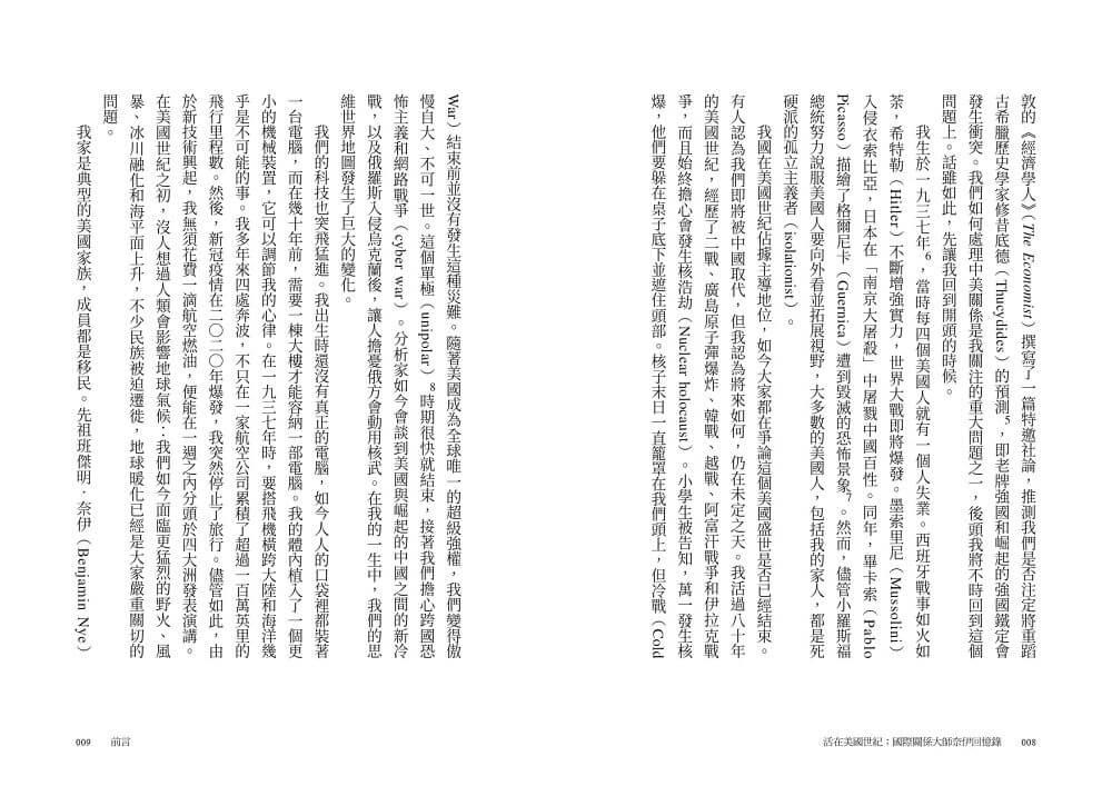 自二戰結束以來,全球持續處於通稱為「美國世紀」的時期。值此時刻,美國在全球舞台上享有霸權,無論在政治、經濟或軍事上皆無與倫比。奈伊出生於這個新時代的開端,觀其一生,歷任主管國際安全事務的助理國防部長、國家情報委員會主席和副國務次卿,身居要職的高度,他的傳記可概覽美國實力和世界事務不斷變遷的輪廓。他著作等身,探討權力本質和政治領導力,被讚譽為當今世界上最有影響力的國際關係分析師。