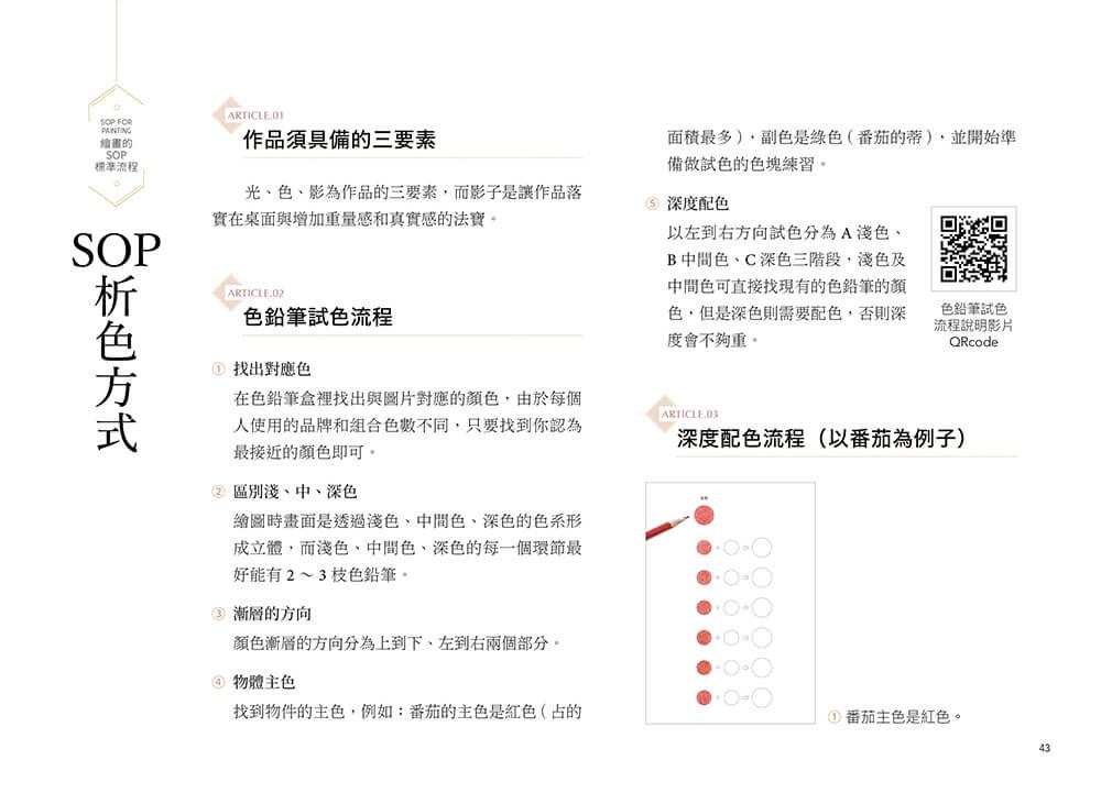透過SOP流程和詳細教學,跟著構圖格放法、析色SOP流程,帶你突破繪畫的關鍵步驟,讓你將能在短時間內畫出具細節感的寫實作品,下筆不猶豫!