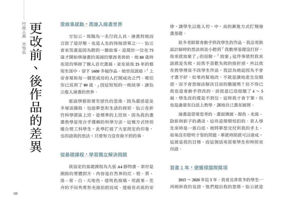 透過簡單易懂的形式,提供突破傳統3年4個月的學習模式,以及學院派長時間的專業學習,且在師生互動中仍能夠彰顯身教與言教的精神,相信不僅有助於快速學習,更能夠助人完成夢想,值得推薦。──國立清華大學藝術與設計學系教授兼系所主任蕭銘芚