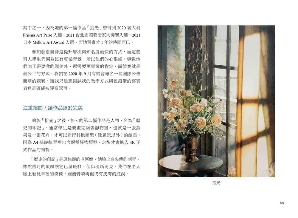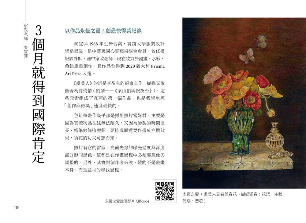 所以色鉛筆畫該用怎樣的方式呈現呢?這個我們從小啟蒙的工具全世界都在使用它,在我們不懂繪畫時用塗鴉表達的鉛筆呀!鉛筆小筆頭畫出的細線怎樣能積聚成面這是大工程。怎樣做到與眾不同,我參考了坊間的色鉛筆作品,也思考色鉛筆本身的優缺點,於是2015年發明了SOP流程式的教學法,2017年3月出了色鉛筆畫的工具書,由於一些原因我只針對學畫的學生使用,來學的學生很多超過300位,書很快就賣完了。教學的過程讓我能力增進很大,在2018~2021年每年的藝術競賽都有多位學生嶄獲入選名額,尤其是2020年義大利的PrismaArtPrize14人參加全員入選其中還包括第四名與第六名。2021台北國際藝術家大獎賽來自82國、4342件作品中,共有388件作品脫穎而出台灣占40幅,很幸運我和三位學生入選了6幅作品,其中二位學生是學畫不到一年的素人。