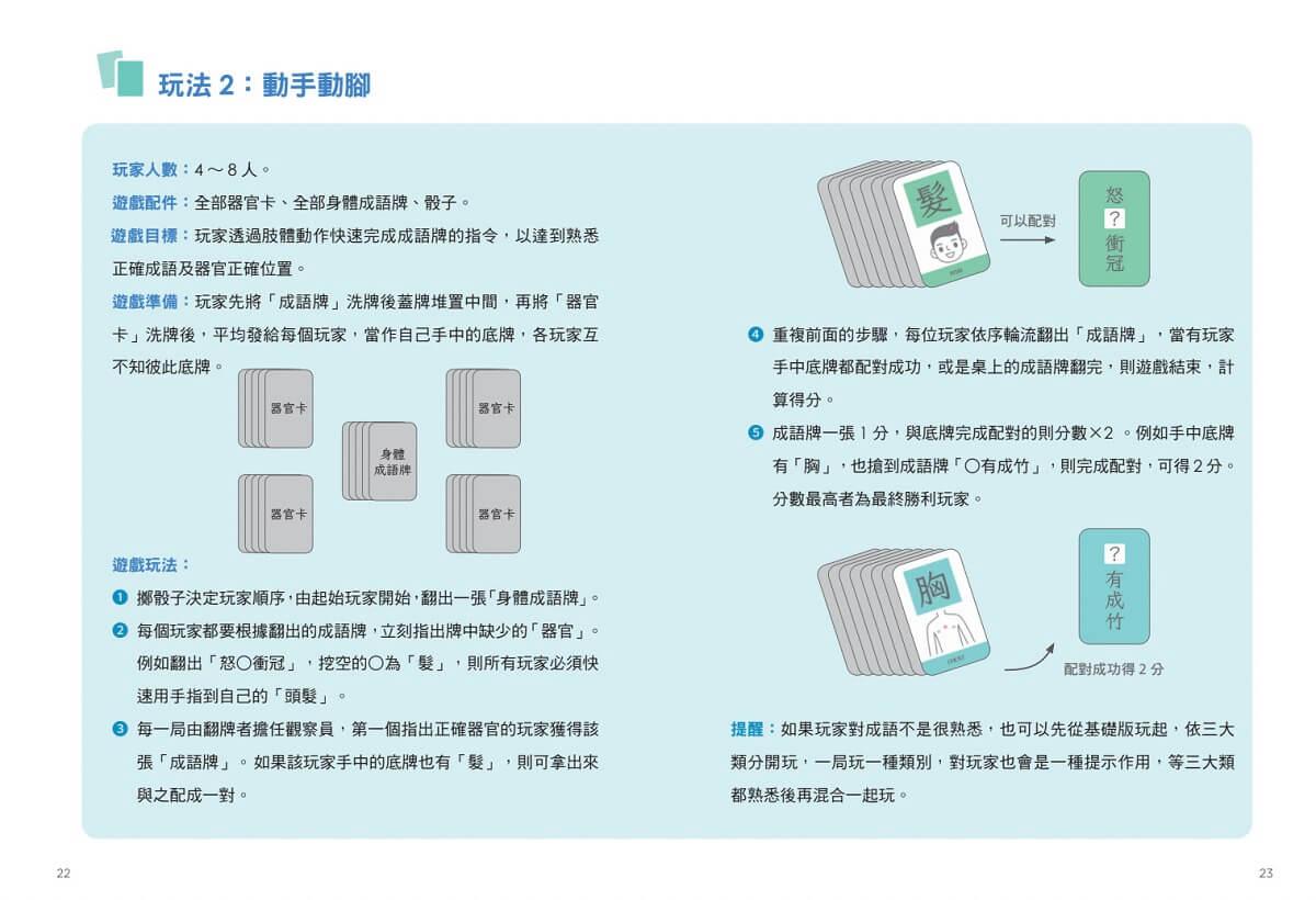 ■孩子——自學交友兩相宜:動成語中共有 160個成語, 24張器官卡,先一張一張試著說出正確成語和讀音,看看答對率是多少;接著搬出字典或請大人協助進入網路的「教育部成語典」,認識它、熟悉它、讀懂它,然後掌握它,最後約及三五同學好友,不囉唆,開始玩就對了!也請記住,遊戲說明書中的遊戲規則都只是參考,你絕對可以改變遊戲,玩出自己的無限想像!