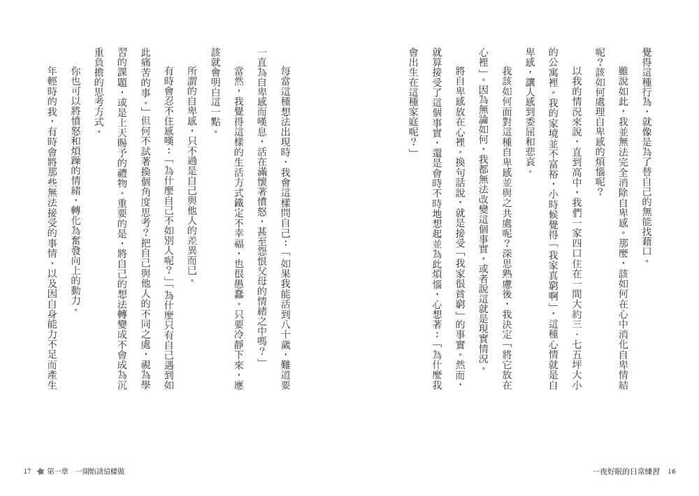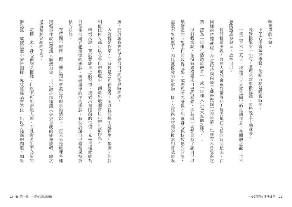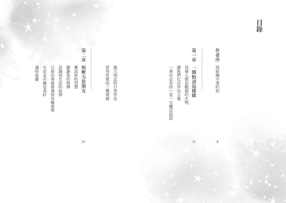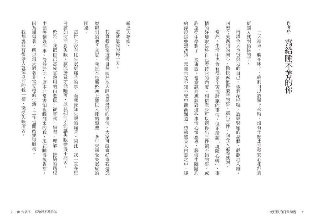 這本書就是為了每天因失眠而苦惱、備受折磨的各位而撰寫的,我整理出有助於自己入睡的一點想法、心態和方法。