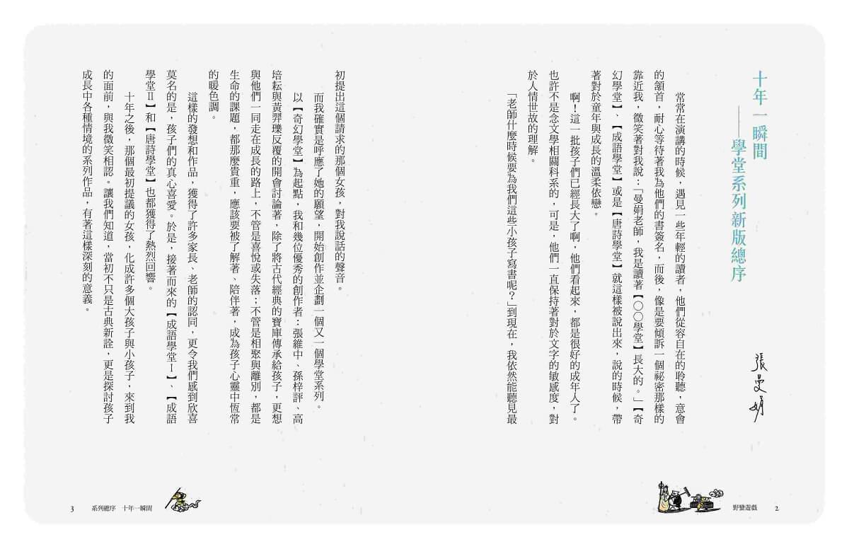 常常在演講的時候,遇見一些年輕的讀者,他們從容自在的聆聽,意會的頷首,耐心等待著我為他們的書簽名,而後,像是要傾訴一個祕密那樣的靠近我,微笑著對我說:「曼娟老師,我是讀著【○○學堂】長大的。」【奇幻學堂】、【成語學堂】或是【唐詩學堂】就這樣被說出來,說的時候,帶著對於童年與成長的溫柔依戀。