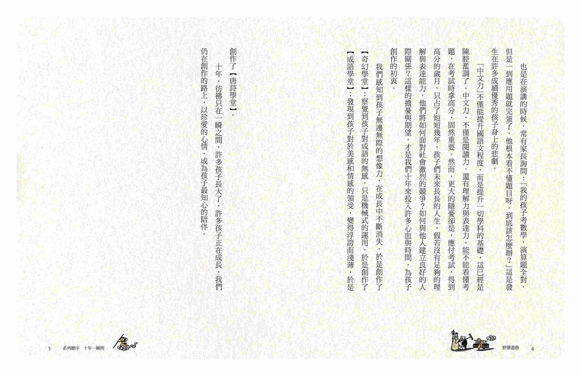 我們感知到孩子無邊無際的想像力,在成長中不斷消失,於是創作了【奇幻學堂】;察覺到孩子對成語的無感,只是機械式的運用,於是創作了【成語學堂】;發現到孩子對於美感和情感的領受,變得浮誇而淺薄,於是創作了【唐詩學堂】。
