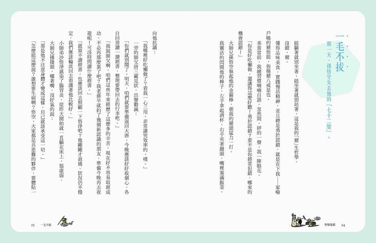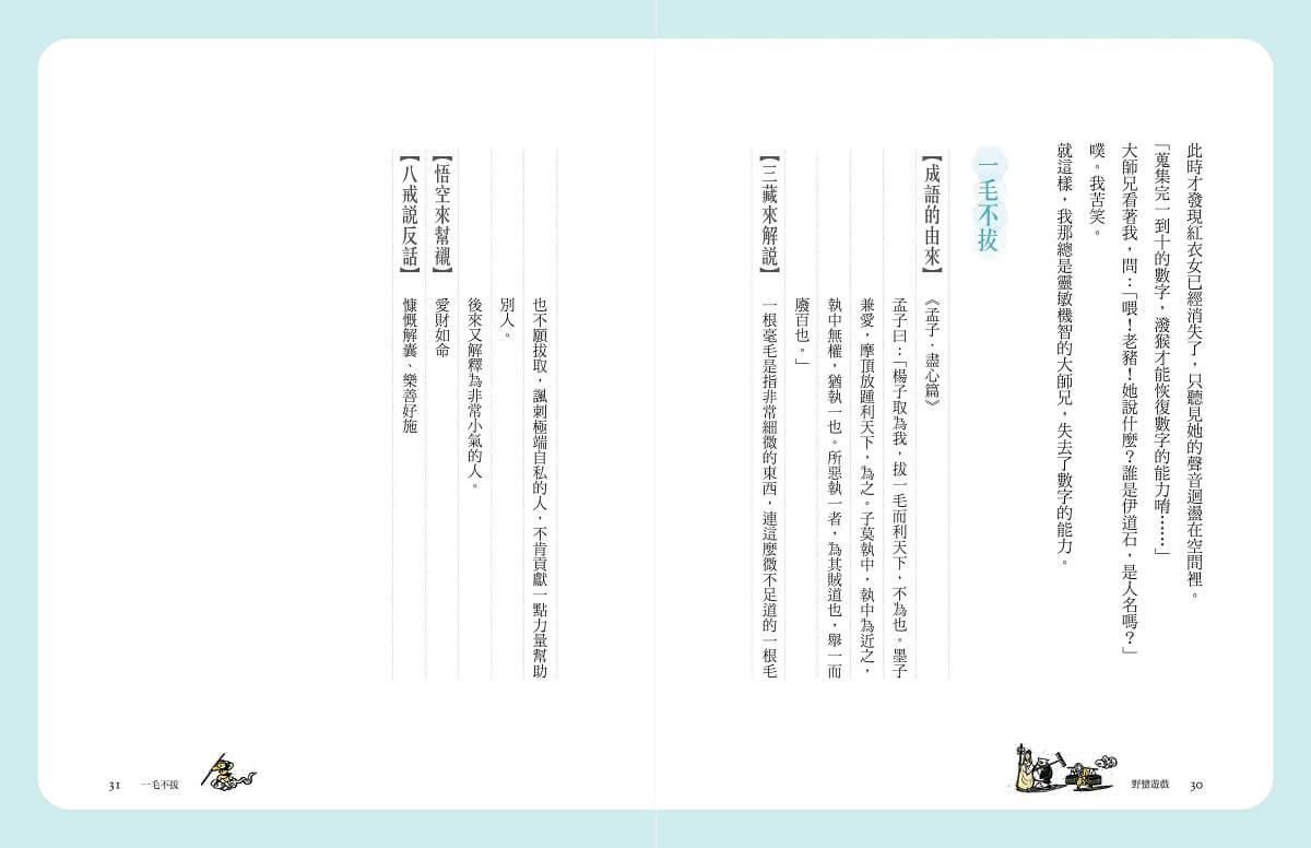 師父又轉身對孫悟空說明:「悟空啊!戰國時代有個思想家叫楊朱的,認為做人做事應該不損己為人,但也不應該損人為己。儒家的孟子卻覺得這種說法,代表他非常小氣,自私自利,不肯貢獻一己心力。即使只需要拔一根毛髮就能助人,卻也不願意。這就是『一毛不拔』的由來啊,你明白了嗎?」