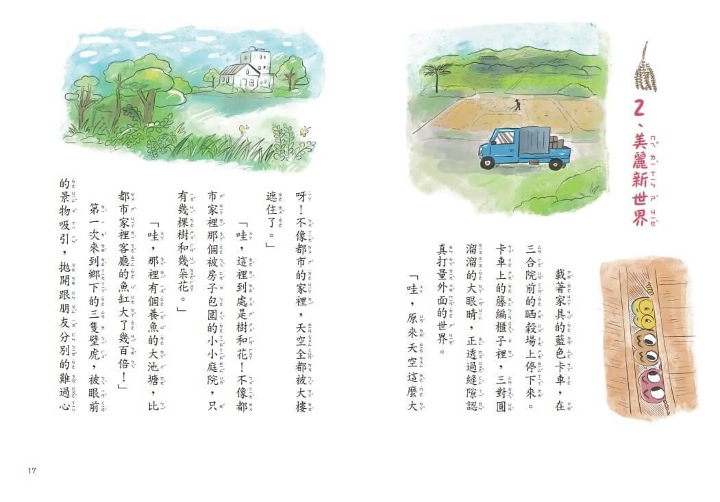愛冒險的三隻壁虎溜進櫃子,搭上貨車,從都市來到鄉下。