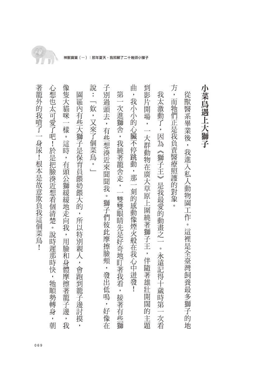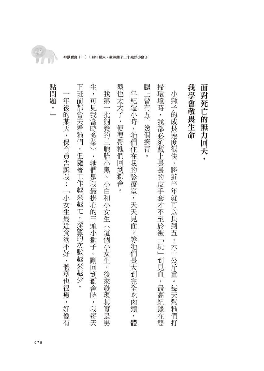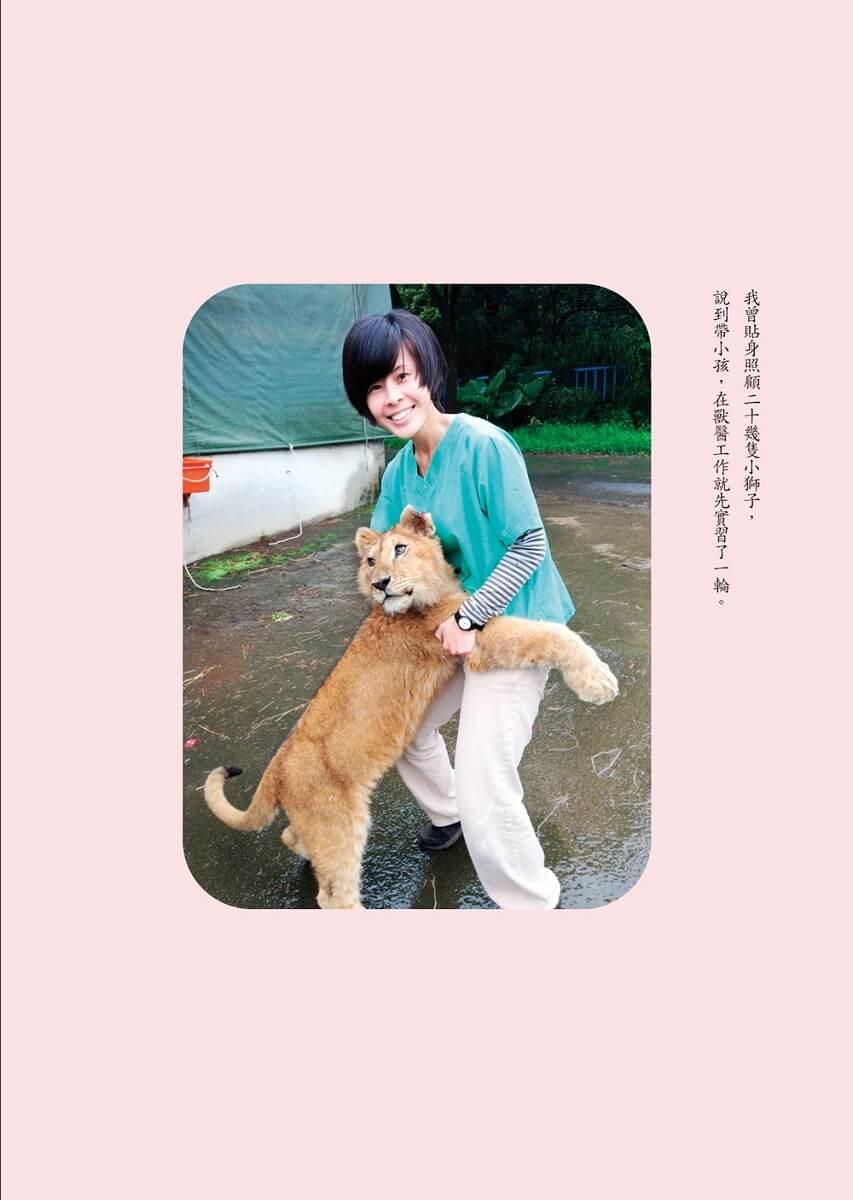 ● 第一份工作在私人動物園,綦孟柔主動請纓擔任「獅子王」的御用獸醫師,狂吸大貓,如母親般帶大二十幾頭獅寶寶,卻也悲傷地送走心頭肉……【面對死亡的無力回天,她學會敬畏生命。】