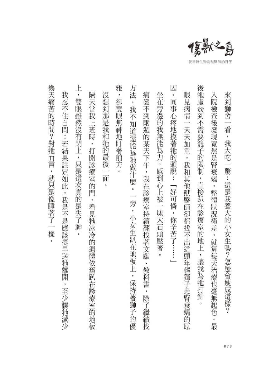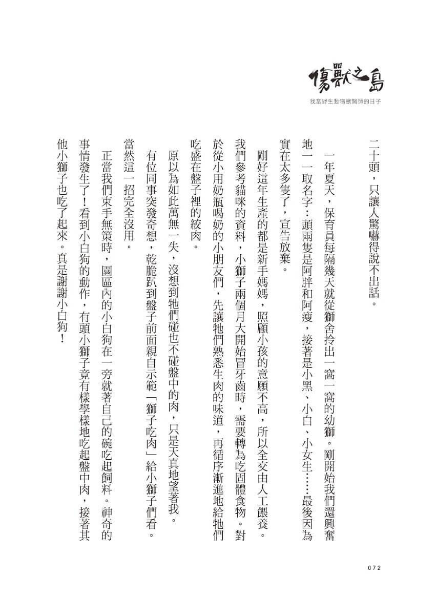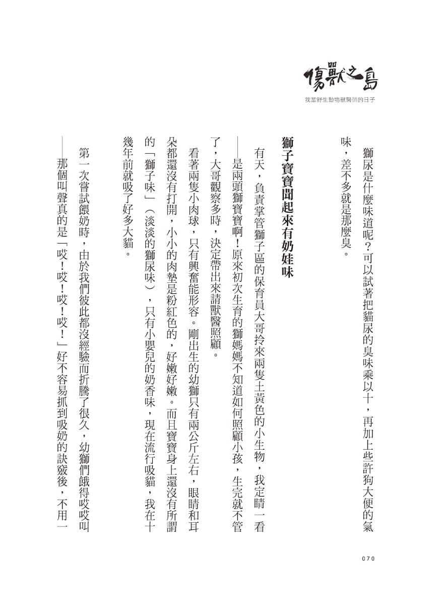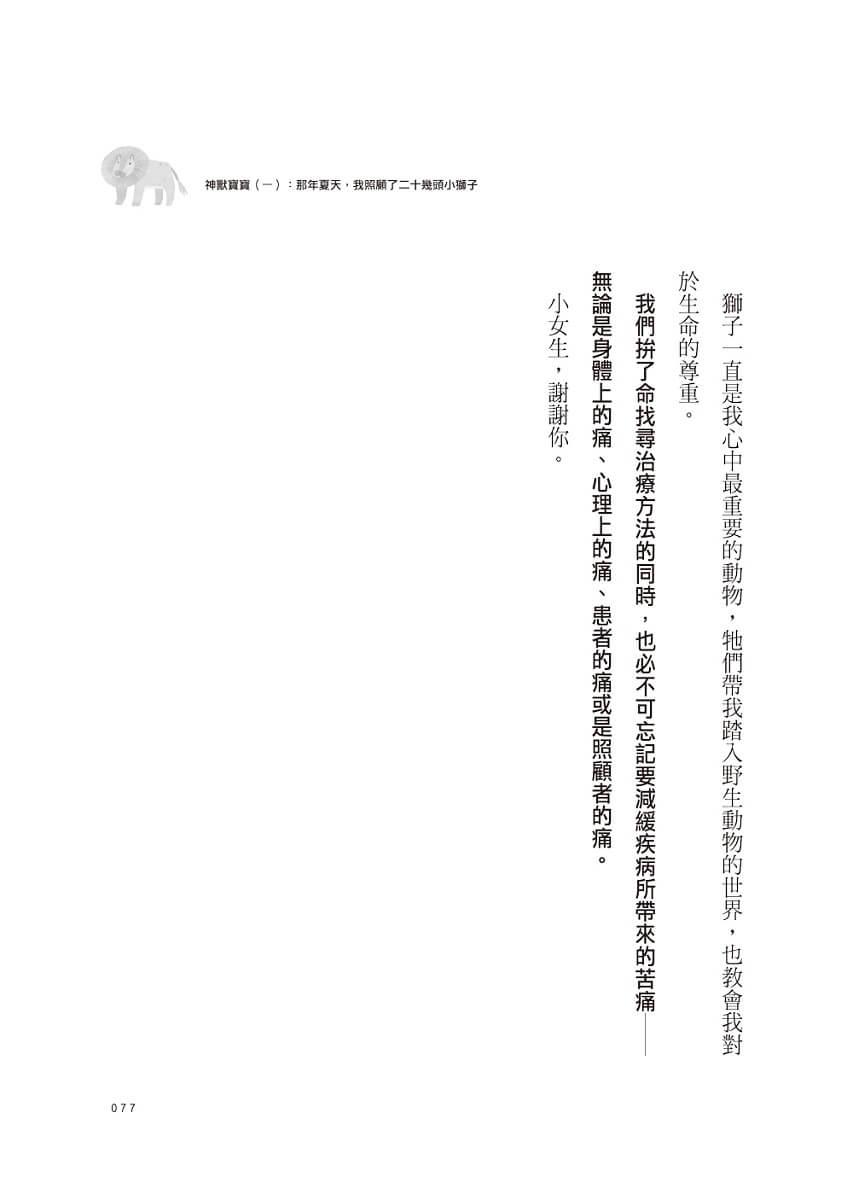 ● 第一份工作在私人動物園,綦孟柔主動請纓擔任「獅子王」的御用獸醫師,狂吸大貓,如母親般帶大二十幾頭獅寶寶,卻也悲傷地送走心頭肉……【面對死亡的無力回天,她學會敬畏生命。】