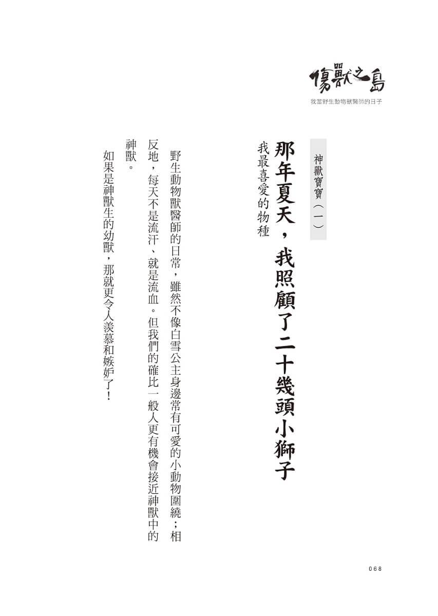 ● 臺灣首位「野生動物獸醫師」出書分享:「那年夏天,我照顧了二十幾頭小獅子;那一瞬間,臺灣黑熊在我眼前張大嘴,我清楚看見那森森銳齒和牽絲的口水……」身為野生動物獸醫師,必須具備分秒必爭的犀利技術、搏命治療的勇氣。