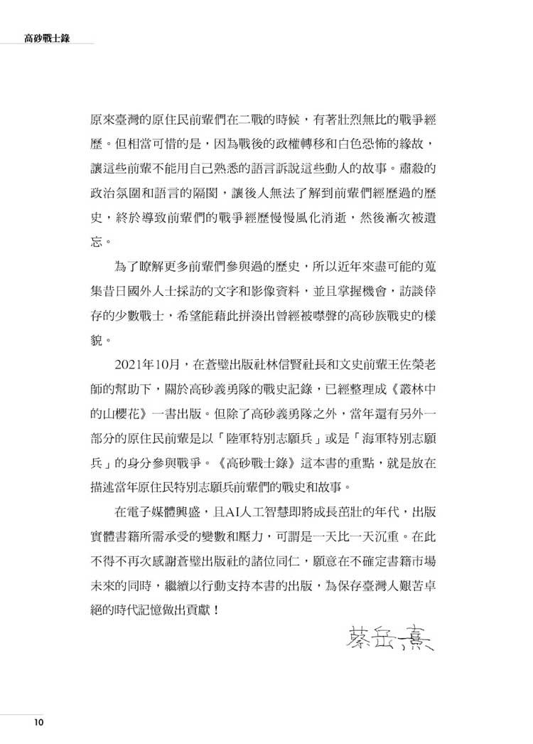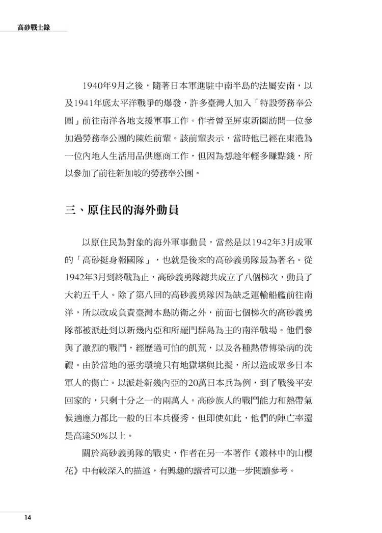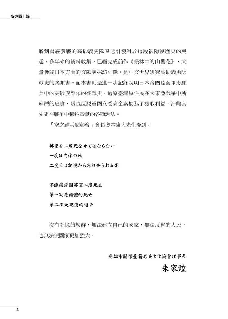 所幸還有不少對重建臺灣近代史保有熱情的專業或業餘人士,透過多年田野調查口訪與原始文獻查閱,慢慢拼湊出歷史原貌。蔡岳熹醫師是筆者高雄醫學院的前輩,出版過不少由日文翻譯的醫學專業書籍,並非文史專業,但是在早年行醫的過程中接觸到曾經參戰的高砂義勇隊耆老引發對於這段被隱沒歷史的興趣,多年來的資料收集,已經完成前作《叢林中的山櫻花》,大量參閱日本方面的文獻與採訪記錄,是中文世界研究高砂義勇隊戰史的案頭書。而本書則是進一步記錄說明日本帝國陸海軍志願兵中的高砂族部隊的征戰史,還原臺灣原住民在大東亞戰爭中所經歷的史實,這也反駁黨國立委高金素梅為了獲取利益,汙衊其先祖在戰爭中犧牲奉獻的各種說法。