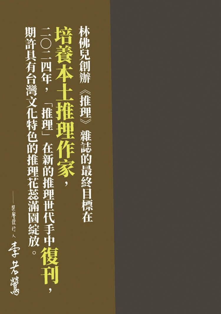 《推理》雜誌長期作為本土作家發表創作的重要園地,在漫長的空白後,如何通過新世代的視角與對類型文學更寬廣的定義、詮釋,接續起犯罪推理在台灣的本土化發展?令人引頸期待!本期收錄內容如下:
