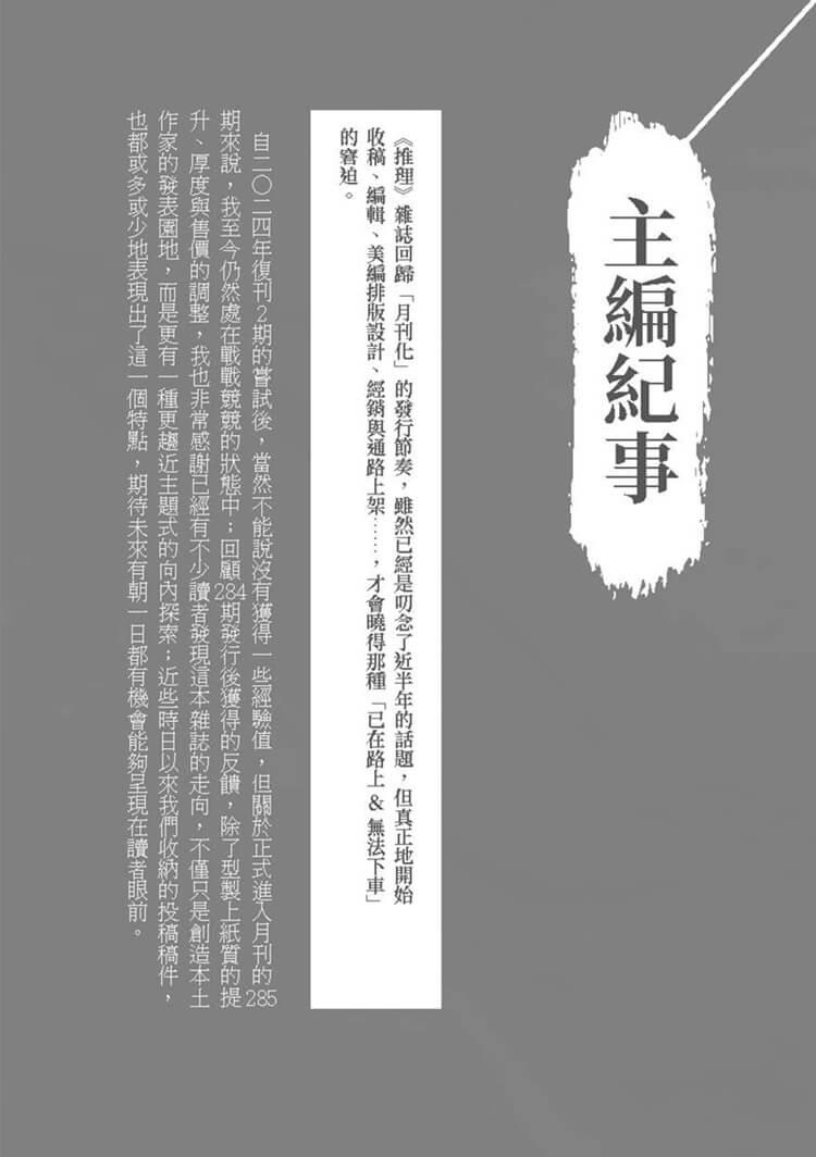 感謝共同組成《推理》雜誌的每個人與285期的每個文字。每一期雜誌必然都是不容錯過的,因為錯過的可能永遠無法為人所知,但我們終究能夠在未來的路上,再次拾回,也不一定。