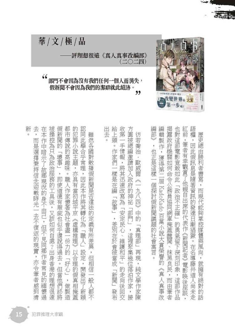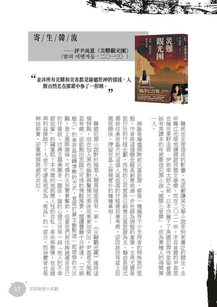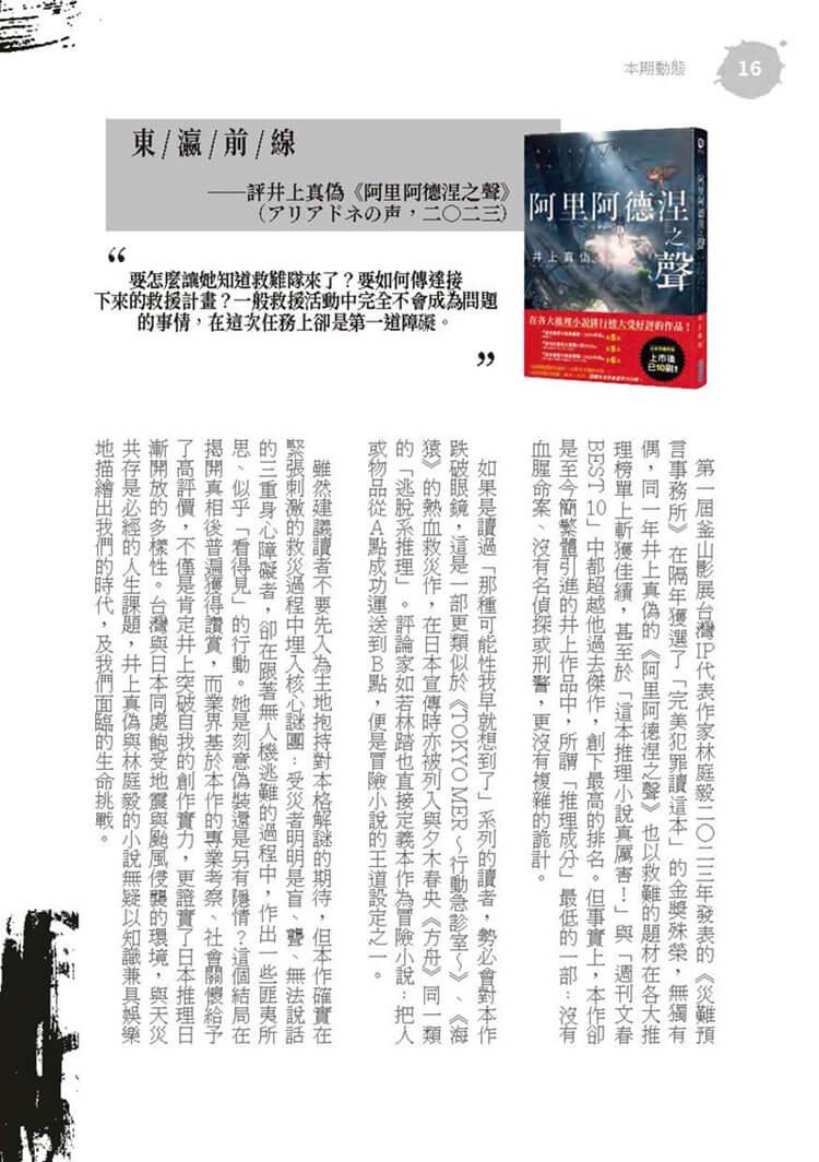 特別收錄劉建志〈生命中不能承受之重——太一〈負重一萬斤長大〉〉一文,跨界探討歌曲歌詞中的人心意圖;同時,舊名「推理小說大家看」的專欄復刻回歸,新專欄「犯罪推理大家觀」每期針對華文;日本、韓國的犯罪創作小說進行評介,不容錯過。
