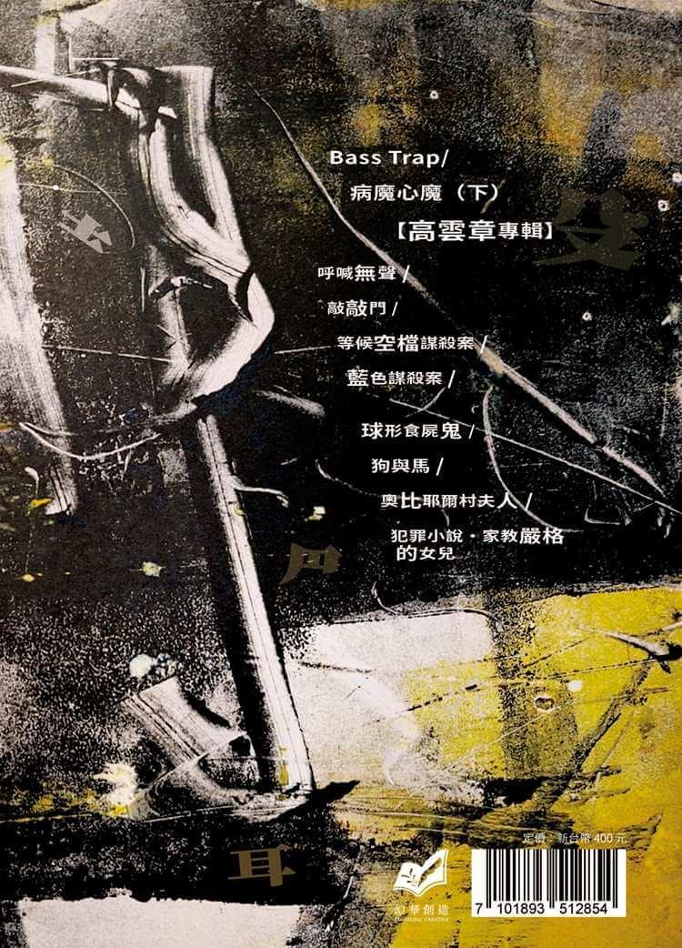 收錄本土作家貝爾夫人〈病磨心魔〉的下集故事,以及M.S. Zenky帶來最新的音樂主題犯罪小說〈Bass trap〉,本土犯罪創作走向全新型態;專訪出身推理雜誌的作家高雲章先生,探究撰寫犯罪故事的心法與歷程,並收錄最新短篇小說〈袋子〉。