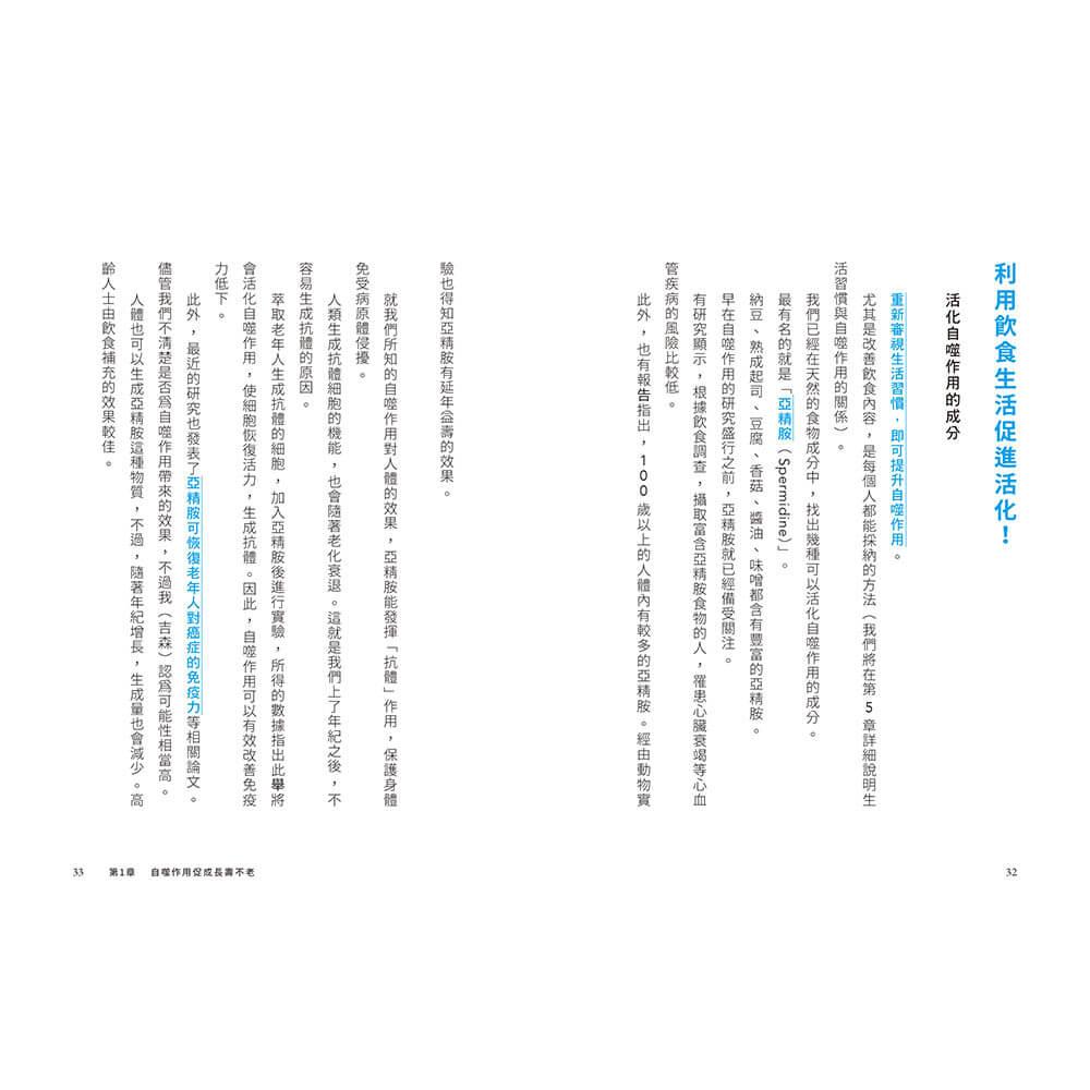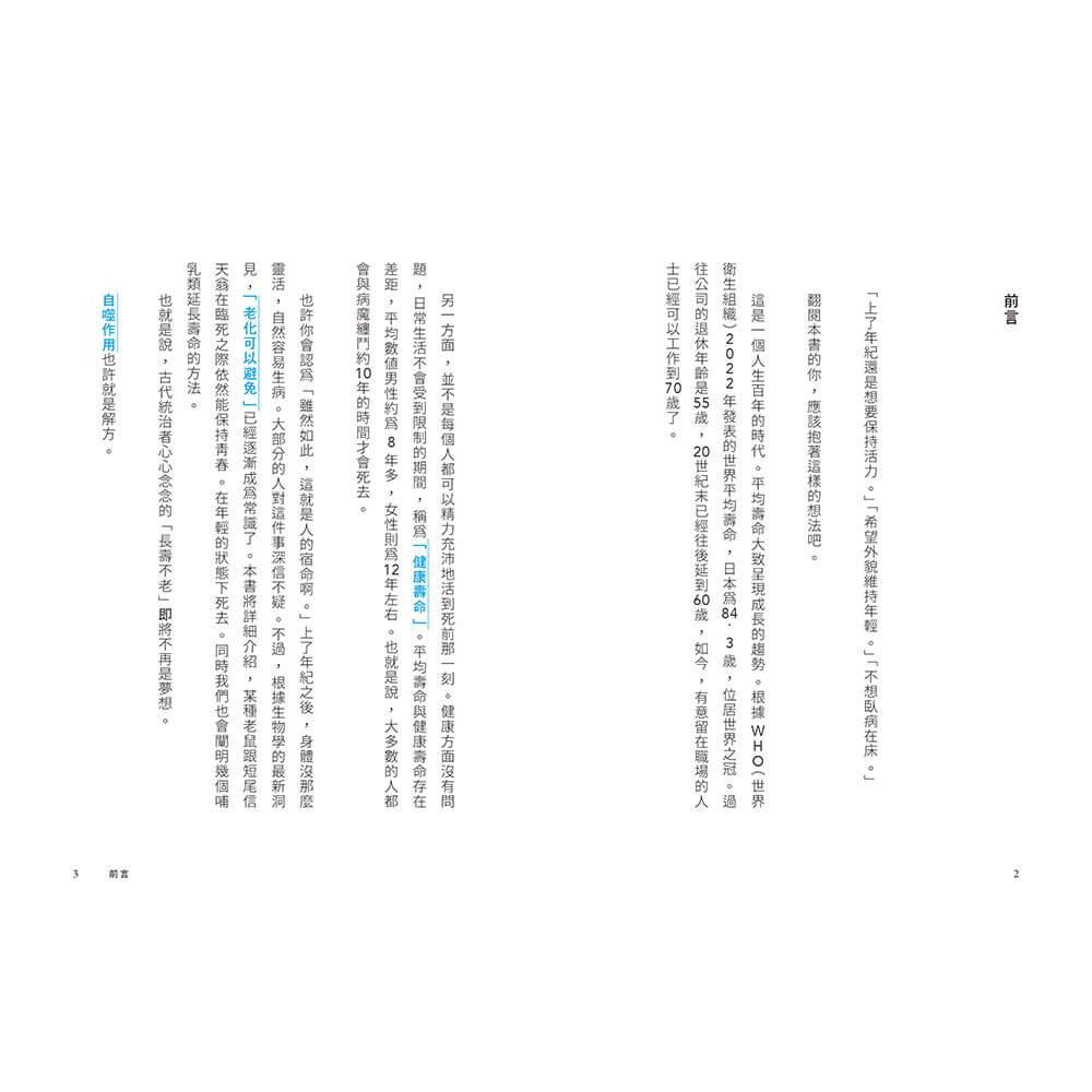 自噬作用可以提升因高齡而下降的免疫力,對於預防傳染病也相當有效。有動物實驗發現,在維持細胞自噬的情況下,即使年屆高齡,依然能維持高水準的運動量。此外,細胞新生也引起美容業界的關注。只要善加運用使細胞新生的自噬作用,應該會發展出與現在完全不同的預防斑點與細紋的方法。和過往的細胞自噬相關書籍相比,本書將會更深入地闡述最新的研究結果。