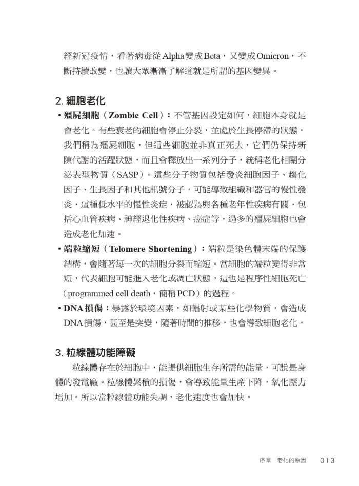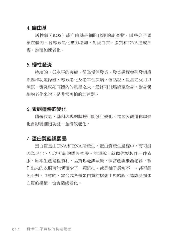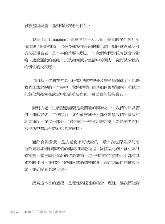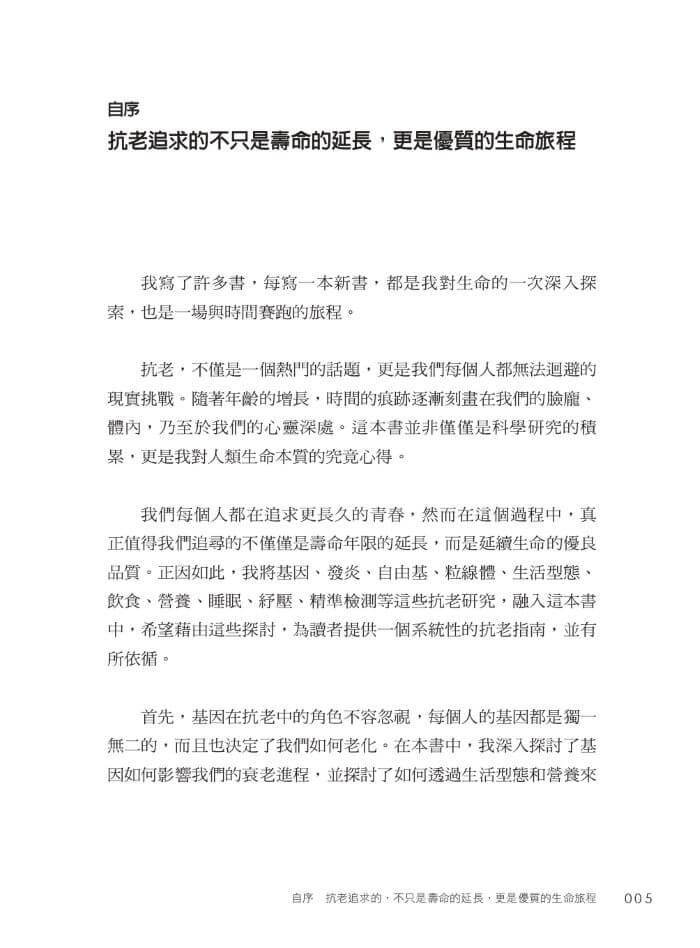 我們每個人都在追求更長久的青春,然而在這個過程中,真正值得我們追尋的不僅僅是壽命年限的延長,而是延續生命的優良品質。正因如此,我將基因、發炎、自由基、粒線體、生活型態、飲食、營養、睡眠、紓壓、精準檢測等這些抗老研究,融入這本書中,希望藉由這些探討,為讀者提供一個系統性的抗老指南,並有所依循。
