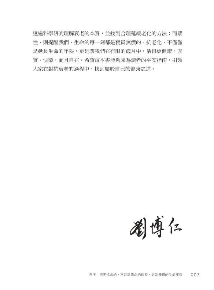 撰寫這本書的過程,是理性與感性的結合。理性,讓我們能夠透過科學研究理解衰老的本質,並找到合理延緩老化的方法;而感性,則提醒我們,生命的每一刻都是寶貴無價的。抗老化,不僅僅是延長生命的年限,更是讓我們在有限的歲月中,活得更健康、充實、快樂,而且自在。希望這本書能夠成為讀者的平安指南,引領大家在對抗衰老的過程中,找到屬於自己的健康之道。