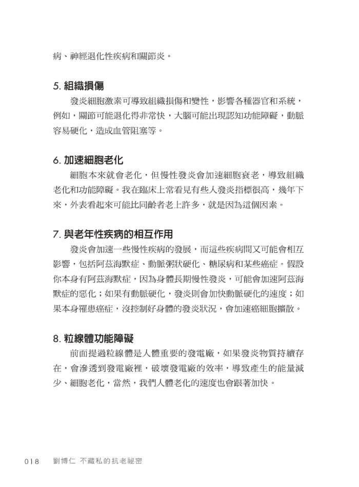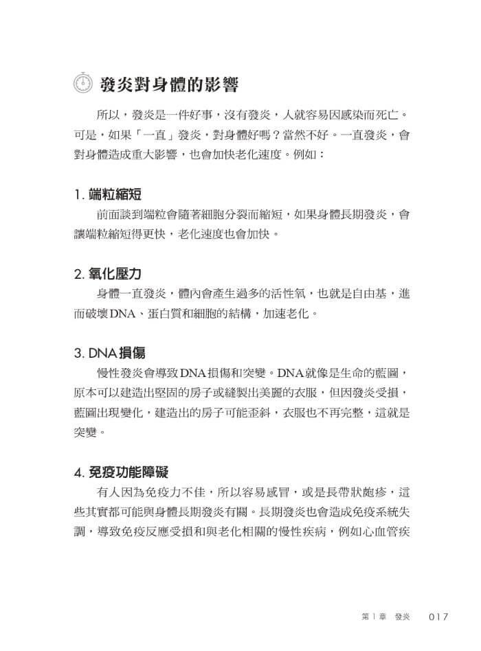 發炎(inflammation)是衰老的一大元兇,長期的慢性炎症不僅加速了細胞損傷,也是多種慢性疾病的催化劑,如何透過減少發炎來延緩衰老,是本書的重要主題之一。我們會探討抗炎飲食的策略、適度運動的益處,以及如何減少生活中的壓力,從而減少體內的慢性發炎反應。
