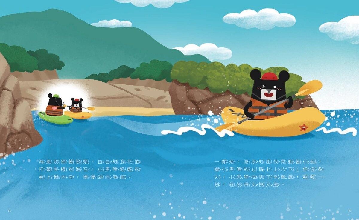 一開始,波浪的起伏晃動著小船,讓小黑啤的心情七上八下;但沒多久,小黑啤找到了平衡感,輕輕一划,就划得又快又遠。