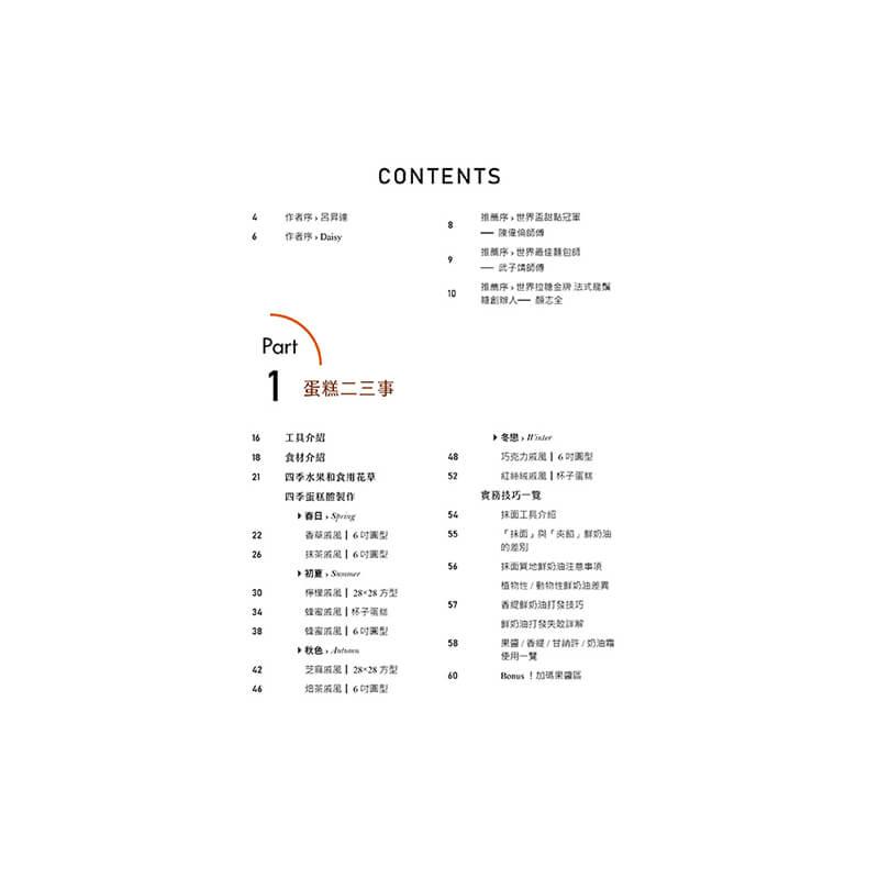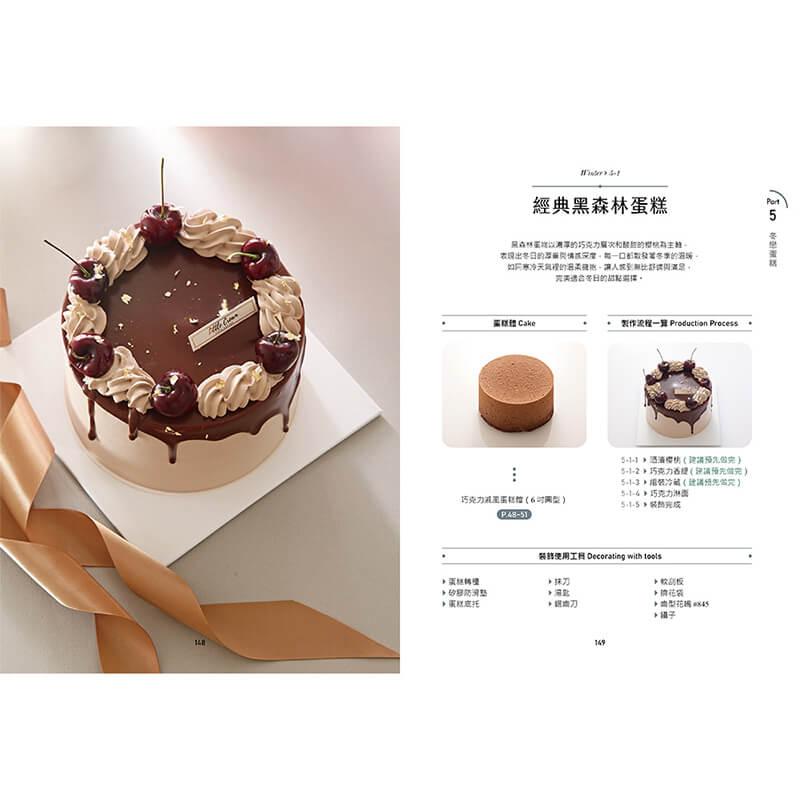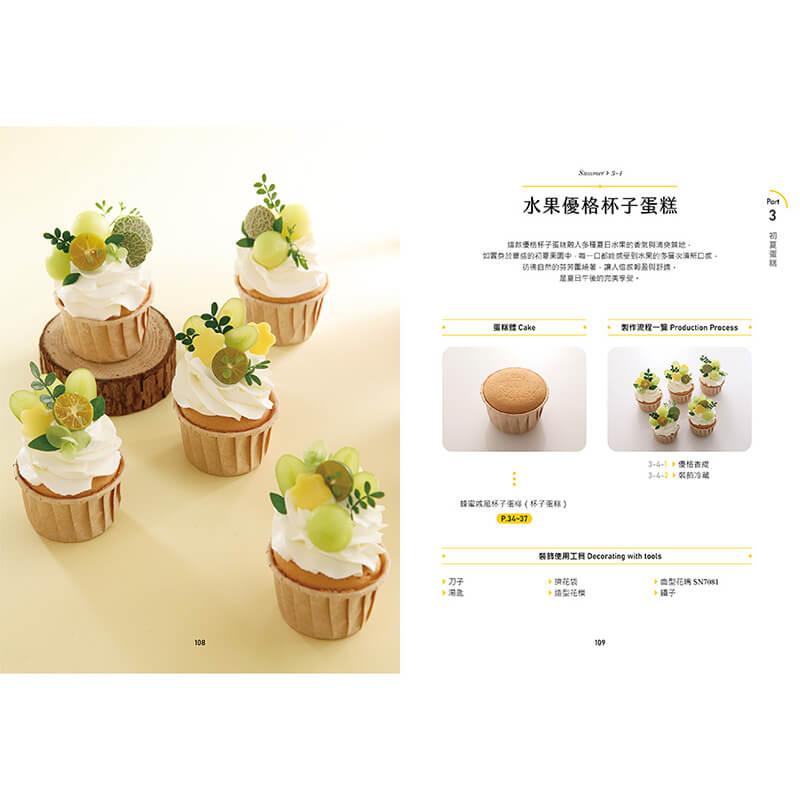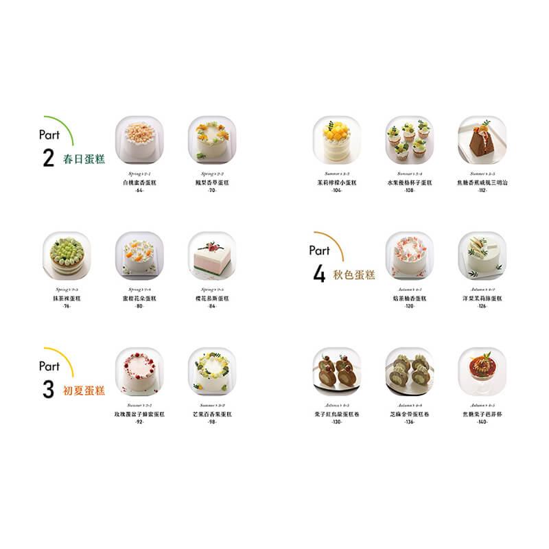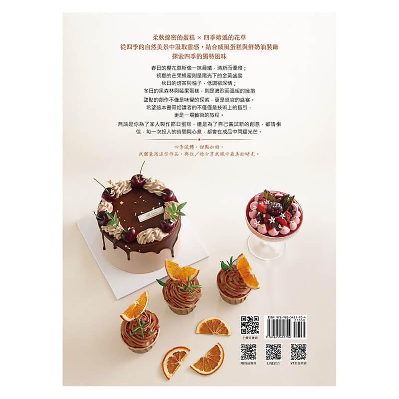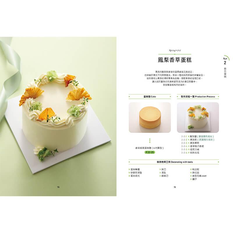 後四章依照春夏秋冬依序排列,以對應季節的蛋糕體進行裝飾,收錄針對不同季節特色的裝飾技巧及創意靈感。例如:春季收錄以鮮花為主題的蛋糕,細緻描繪了如何利用新鮮的食用花卉與季節水果,打造充滿春意的蛋糕作品;夏季則強調清涼感和色彩繽紛的水果裝飾,教你如何用多汁的莓果和熱帶水果,製作出令人耳目一新的蛋糕造型。