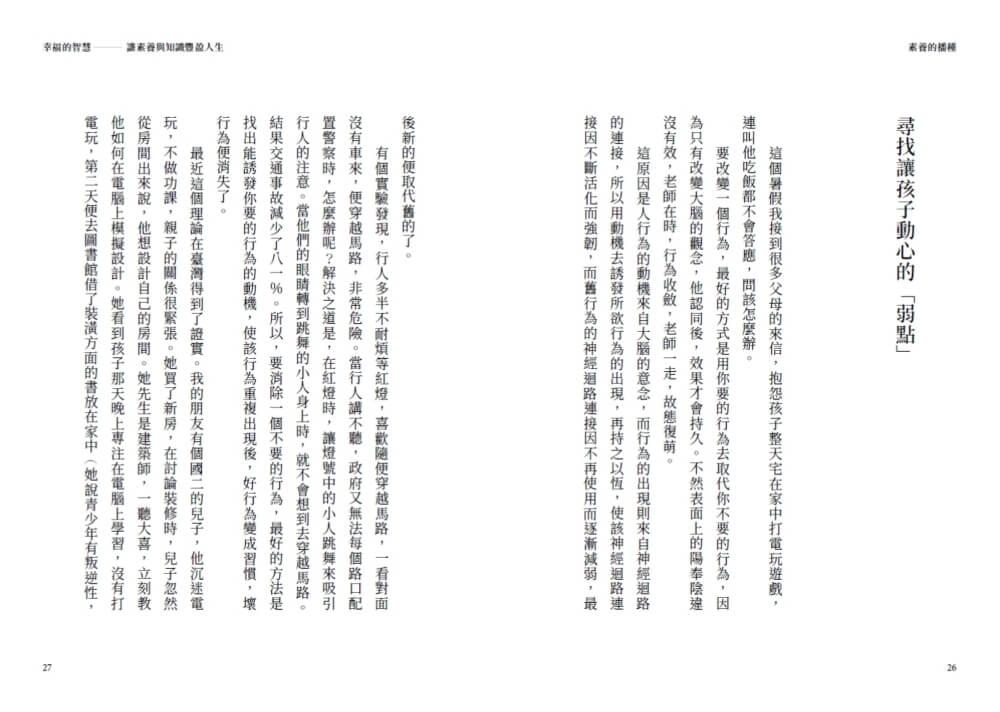 書中有些文章是我對當時社會發生的一些現象提出大腦方面的解釋,希望能透過實驗證據改變舊有觀念。比如臺灣的父母親很在乎分數,整天恨鐵不成鋼,這種忘記初衷的嫌棄(孩子剛出生時,我們不是只要他四肢健全、身體健康就滿足了嗎?怎麼後來變心了呢?)會傷孩子的自尊和自信。其實孩子只要開竅,早點晚點沒有關係,開竅早,少年得志,開竅晚,大器晚成。月考(現在叫段考)的壞處就是柳宗元《種樹郭橐駝傳》中說的,若是每個月都把樹挖起來看它長根了沒有,樹當然長不好,人生反正看的是終點,哪個跑馬拉松的人是在搶起跑線的?