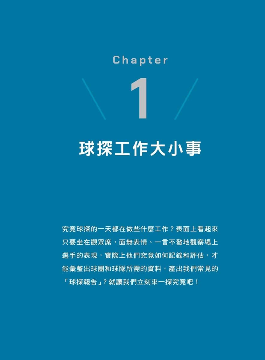 打球的生涯中,我也遇過不少球探,特別是還未成為職棒球員時。認真的球探不只會關注你的比賽狀況,還會關心場下的生活作息和心理狀態。當然,也有只是公事公辦的球探,看看比賽做做紀錄就交差的,而這之間的差異,便有可在早期,球探並不是一個專門的工作,比較類似球隊或相關球員之間的相互介紹和打聽。十九世紀,棒球運動就已經風行於美國,但直到該世紀末才出現了第一個所謂的球探,但並未支薪,本質其實是一個棒球員。之後慢慢隨著需求的增加,才形成了愈來愈完整的球探制度,到了二十世紀,美國甚至有了大聯盟球探局的設立。只是後來又日漸式微,變成各球團各有所屬的球探部門。這其中的變化與歷史上具代表性的球探,都可在書中看到相當精彩的故事。
