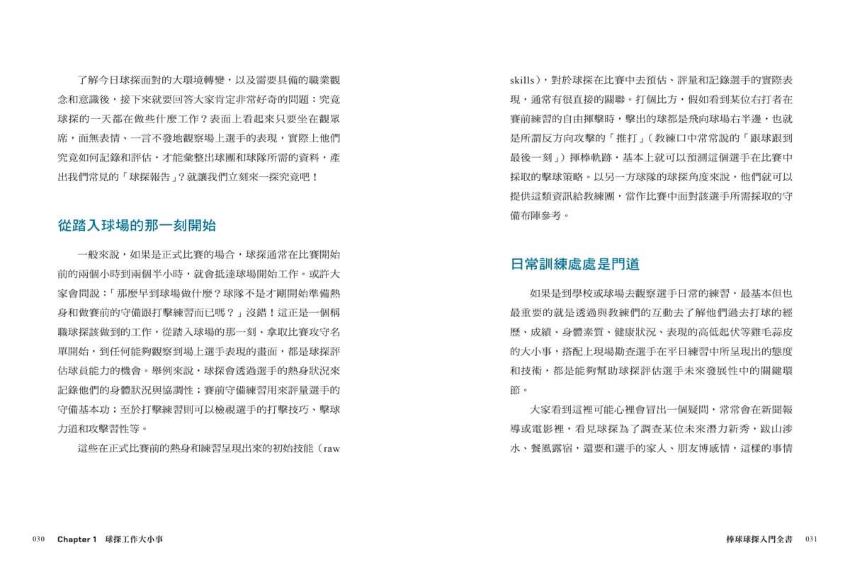 這顆小小圓圓的棒球,承載我從小到大心智成長過程中所經歷的一切,以及其中對這個運動的熱愛與記憶,總是讓人回味無窮。我也有幸從一個愛上棒球的小孩,成為實際接觸棒球工作的球探,所以很高興能有這個機會,向各位同樣喜愛棒球的球迷朋友分享這個藏身幕後的職業,究竟都在做些什麼工作。