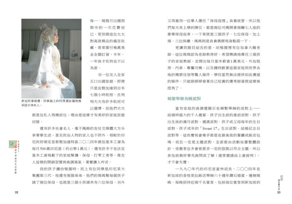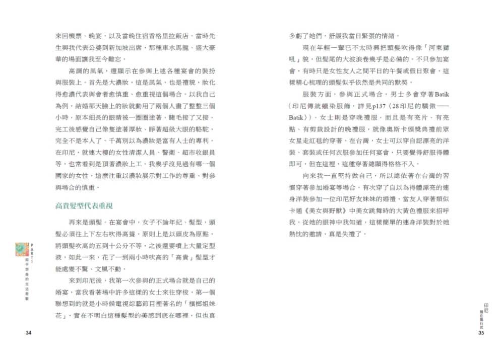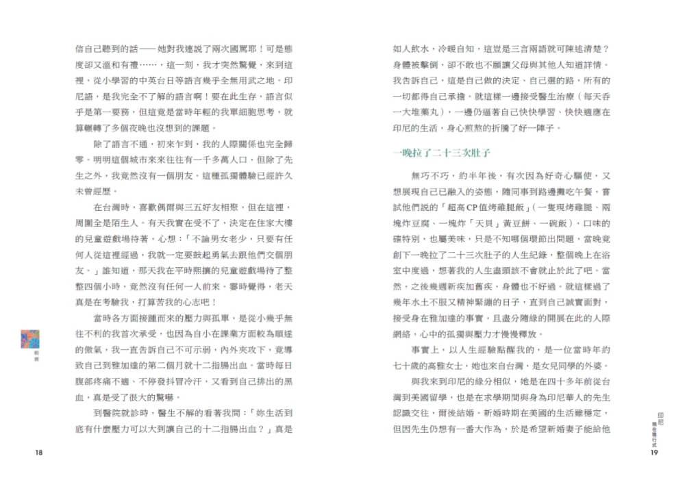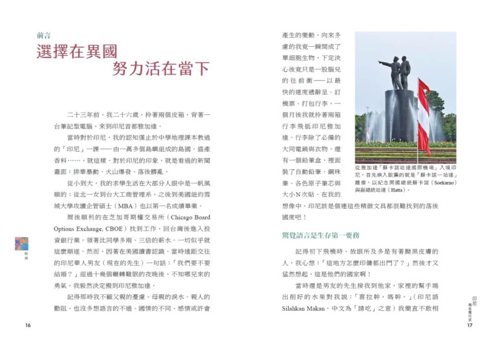 在身心不適與掙扎的過程中,她逐漸調整想法,決定正視眼前的挑戰,重整心力,踏實活在自己的選擇,從零開始學習印尼語。經過逾20年的磨合,她從排斥到接納,從不理解到尊重,一步步站穩腳步,找到自己的生存之道,現擔任精品商務飯店董事長,而本書正是她20年來在印尼生活的最真誠感受與體會。