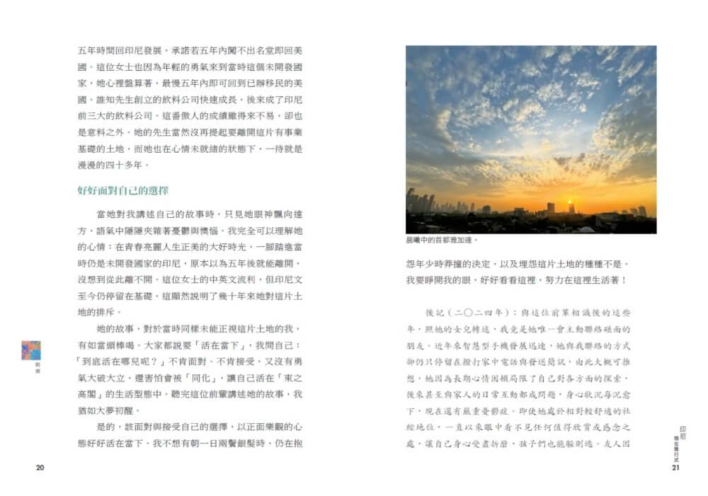 多年前的一念之間,讓自己走了一條從未在人生計畫中的路——移居印尼雅加達。原本設想只是趁著年輕歲月用一年時間看看不同的世界,開開眼界,沒想到因為種種因素竟然在此地一待超過二十年,至今,在雅加達生活的時間竟已開始超過在台灣成長的歲月,思及時光之荏苒,百感交集。