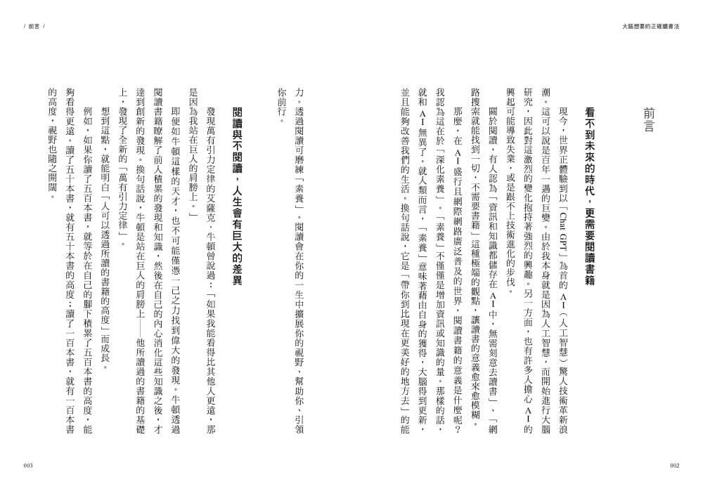 本書首先在第一章基於腦科學的見識,說明閱讀如何提升大腦功能。從第2章到第5章,介紹了應該閱讀哪些書籍以深化學養,每章按主題進行說明。第6章是實踐篇,介紹具體的閱讀方法,最後的第七章則解釋適合AI時代的閱讀方式。