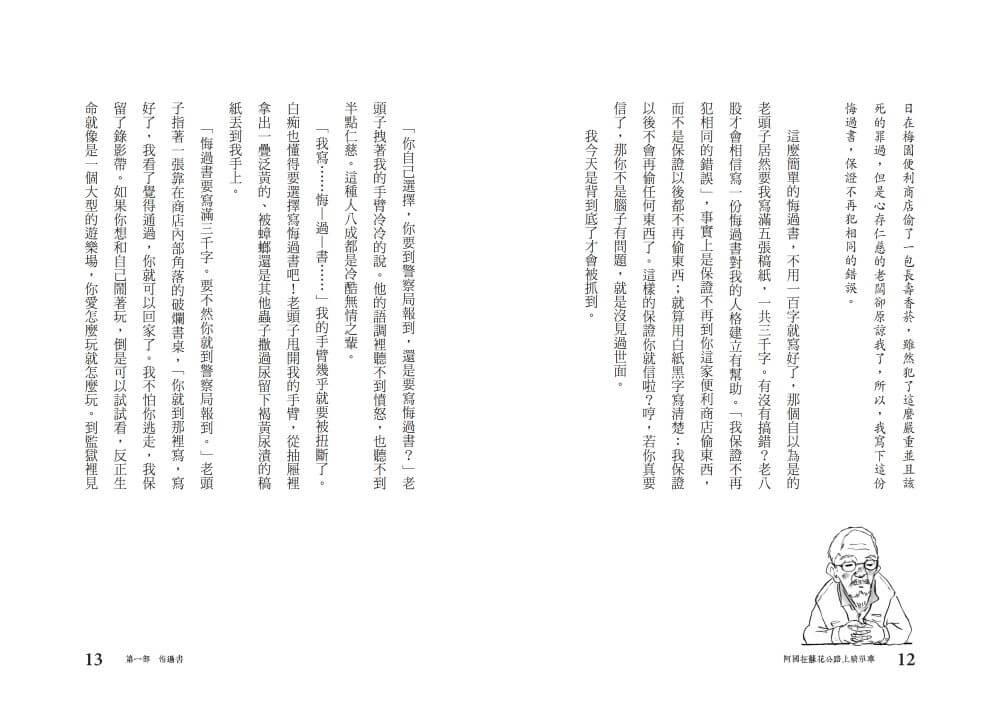 這麼簡單的悔過書,不用一百字就寫好了,那個自以為是的老頭子居然要我寫滿五張稿紙,一共三千字。有沒有搞錯?老八股才會相信寫一份悔過書對我的人格建立有幫助。「我保證不再犯相同的錯誤」,事實上是保證不再到你這家便利商店偷東西,而不是保證以後都不再偷東西;就算用白紙黑字寫清楚:我保證以後不會再偷任何東西了。這樣的保證你就信啦?哼,若你真要信了,那你不是腦子有問題,就是沒見過世面。