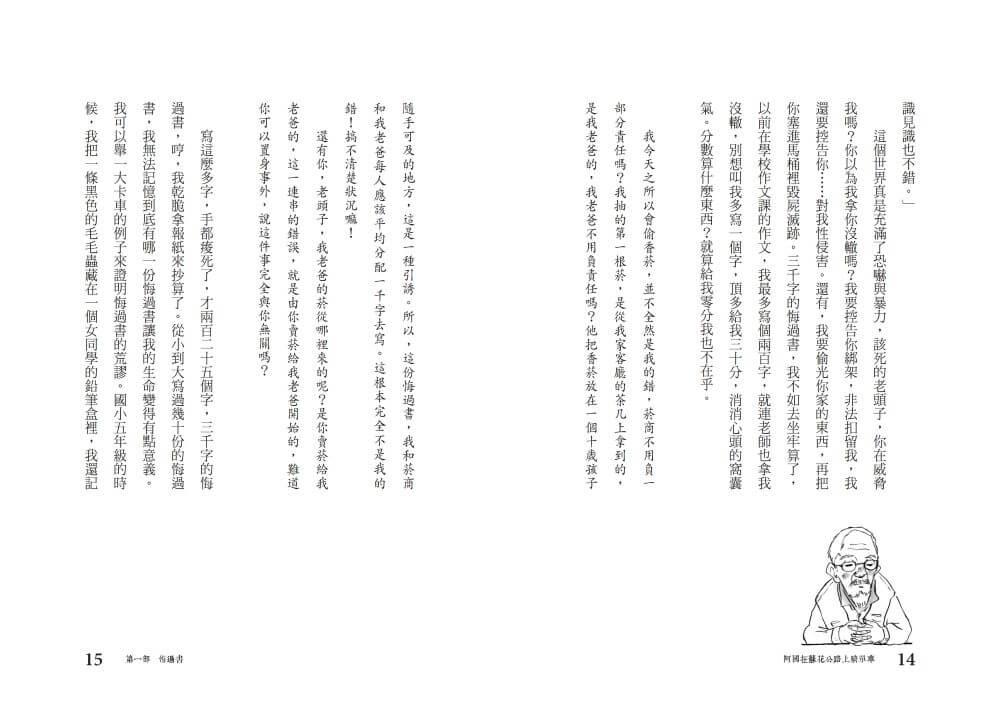寫這麼多字,手都痠死了,才兩百二十五個字,三千字的悔過書,哼,我乾脆拿報紙來抄算了。從小到大寫過幾十份的悔過書,我無法記憶到底有哪一份悔過書讓我的生命變得有點意義。我可以舉一大卡車的例子來證明悔過書的荒謬。國小五年級的時候,我把一條黑色的毛毛蟲藏在一個女同學的鉛筆盒裡,我還記得她叫做林靜文,她在上課的時候打開鉛筆盒,嚇得驚聲尖叫, 跌下椅子昏倒了。我寫下生平第一份悔過書。我在悔過書上寫著「從此不再抓毛毛蟲嚇女同學」,但是,我沒有說不用蟑螂、老鼠、蜥蜴……這些可愛的動物嚇其他女生。老爸第一次看到悔過書的內容,笑得無法遏止。但是當需要他簽字的悔過書越來越多,他就越來越笑不出來了。國小六年級,我因為看見校長沒有敬禮,在校長室寫了三遍「我要尊師重道」的悔過書。國中也因為和同學打架、說謊、到福利社買了一個麵包不付錢,寫了五份悔過書。老爸為此不僅撕毀了悔過書,還賞了我幾個結實的巴掌,讓我至今還常常耳鳴。