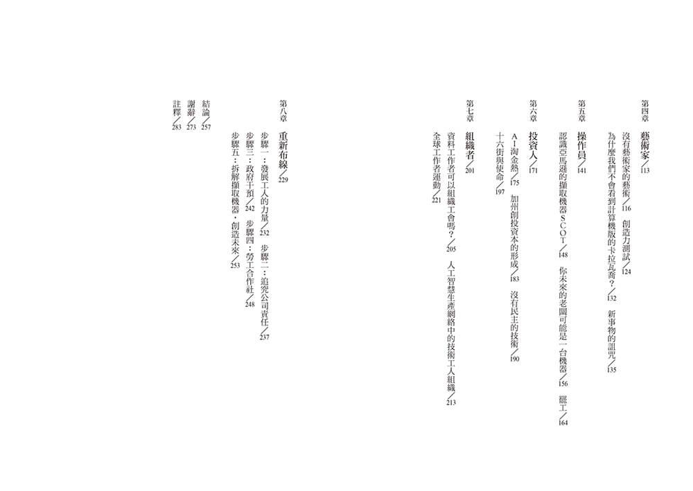 本書的每一章都借鑑了十多年的研究經驗,引導讀者深入探索工人為人工智慧奉獻的不同場景。在接下來的篇幅中,我們將介紹七個在這一過程中扮演關鍵角色的人物。這些都是我們在研究過程採訪的真實人物,每個故事都真實存在,但在某些情況下,我們會採取謹慎的措施刻意隱藏他們的身分,有時也會略過某些訪談內容。這七個角色分別是「標註員」、「工程師」、「技術員」、「藝術家」、「操作員」、「投資人」與「組織者」。藉由展示他們的工作流程、社會背景與日常生活,每一章都讓讀者一窺人工智慧生產中的人性因素及其對工人的影響。在這些角色中,我們將認識一名烏干達資料標註員,她被困在一份枯燥乏味的工作當中,面對有限的機會,她感到無處可逃。我們將見到一名愛爾蘭配音演員,她發現自己的聲音在她不知情的情況下,被機器學習演算法合成,而且這個機器合成的聲音最終可能會取代她的工作。我們也會瞭解一位肯亞政治活動家的故事,他與工人同事一起組織起來,努力改變只為了服務數位經濟中權貴階層的不公正制度。總體的敘事揭露了這七個角色的工作如何相互關聯,以及其中一個角色的行為如何對其他人的生活產生巨大影響。