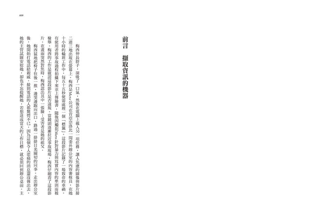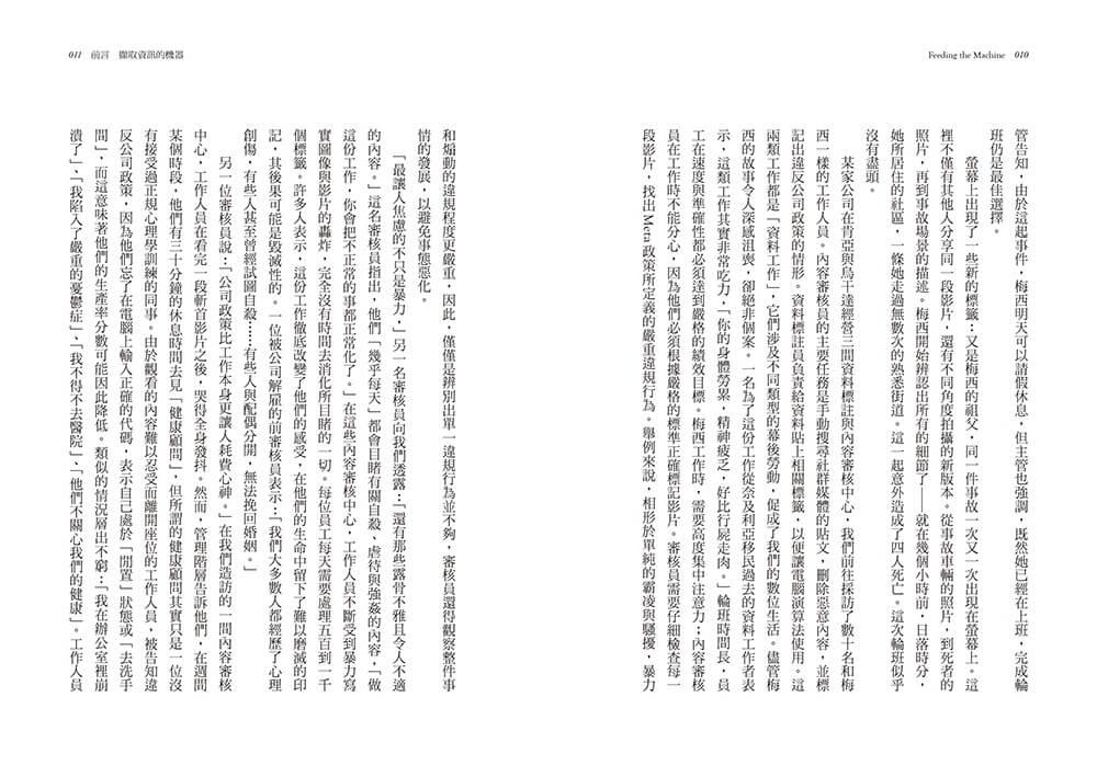 另一位審核員說:「公司政策比工作本身更讓人耗費心神。」在我們造訪的一間內容審核中心,工作人員在看完一段斬首影片之後,哭得全身發抖。然而,管理階層告訴他們,在週間某個時段,他們有三十分鐘的休息時間去見「健康顧問」,但所謂的健康顧問其實只是一位沒有接受過正規心理學訓練的同事。由於觀看的內容難以忍受而離開座位的工作人員,被告知違反公司政策,因為他們忘了在電腦上輸入正確的代碼,表示自己處於「閒置」狀態或「去洗手間」,而這意味著他們的生產率分數可能因此降低。類似的情況層出不窮:「我在辦公室裡崩潰了」、「我陷入了嚴重的憂鬱症」、「我不得不去醫院」、「他們不關心我們的健康」。工作人員告訴我,管理階層會監控員工的就醫紀錄,以驗證員工請病假的正當性,但這種監控並不代表他們希望員工康復,或是真心關切員工的心理健康。