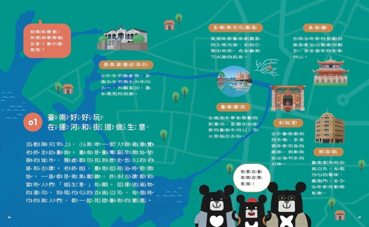 活動隔天早上,小黑啤一家人跟著導覽老師走訪臺南。臺南是臺灣最早開始發展的城市,隨處都可見到歷史悠久的老屋和古蹟。老師說,臺南從荷治時期開始,一直都是商業重鎮,許多古蹟都和當時人們「做生意」有關。從運送貨物的運河,到現代化的百貨公司,每個時代的商人們,都一起見證臺南的變遷。