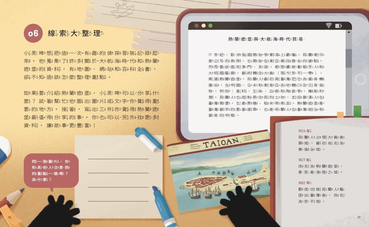 讓我們來認識臺南更多好玩的地方,從臺南的安平古堡出發,探訪世界各地著名的古城堡。接著,了解臺灣的歷史,也認識十七世紀航海家和商人開始到世界各地冒險和做生意的故事。最後,跟著小黑啤學習解答問題的各種方法,練習蒐集資料和整理重點,嘗試自己找答案。
