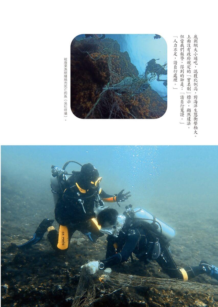 投入動物保護及生態保育社會運動近三十年的歲月裡,這句父母經常碎念我的話,在讀本書時不斷浮上心頭。在面對碧砂漁港附近,一大片面積超過籃球場大的「寶特瓶海」,看著不計其數的寶特瓶在海中隨波盪漾,因海水鹽分、陽光紫外線侵蝕,加上海浪拍打而碎裂成數不清的碎片,猶如「塑膠片湯」一樣。或當背著氣瓶潛入水深十公尺處,赫然看見豎立在海底,高約五公尺、綿延長一百公尺的「底刺網」,無數生物被困在「死亡長城」的網目上,包括保育類綠蠵龜。或在許多海產店裡,見到許多瀕危海洋物種,等待被清蒸、紅燒或沙西米,其中不乏各種國際間早列為「瀕危」等級的鯊魚,如路氏雙髻鯊(又稱紅肉丫髻鮫)、淺海狐鯊,或被過度捕撈、資源量崩解的珊瑚礁魚……不知道陳徵蔚老師心裡可曾浮起這樣的聲音──何苦去管啊!
