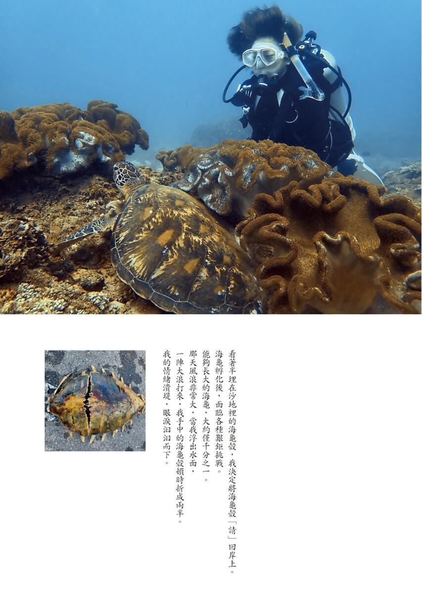海龜殼長期泡在海水中,原本就已經脆化了,加上那天的風浪非常大,當我浮出水面,正準備脫蛙鞋時,一陣大浪打來,我手中的海龜殼頓時被折成兩半。