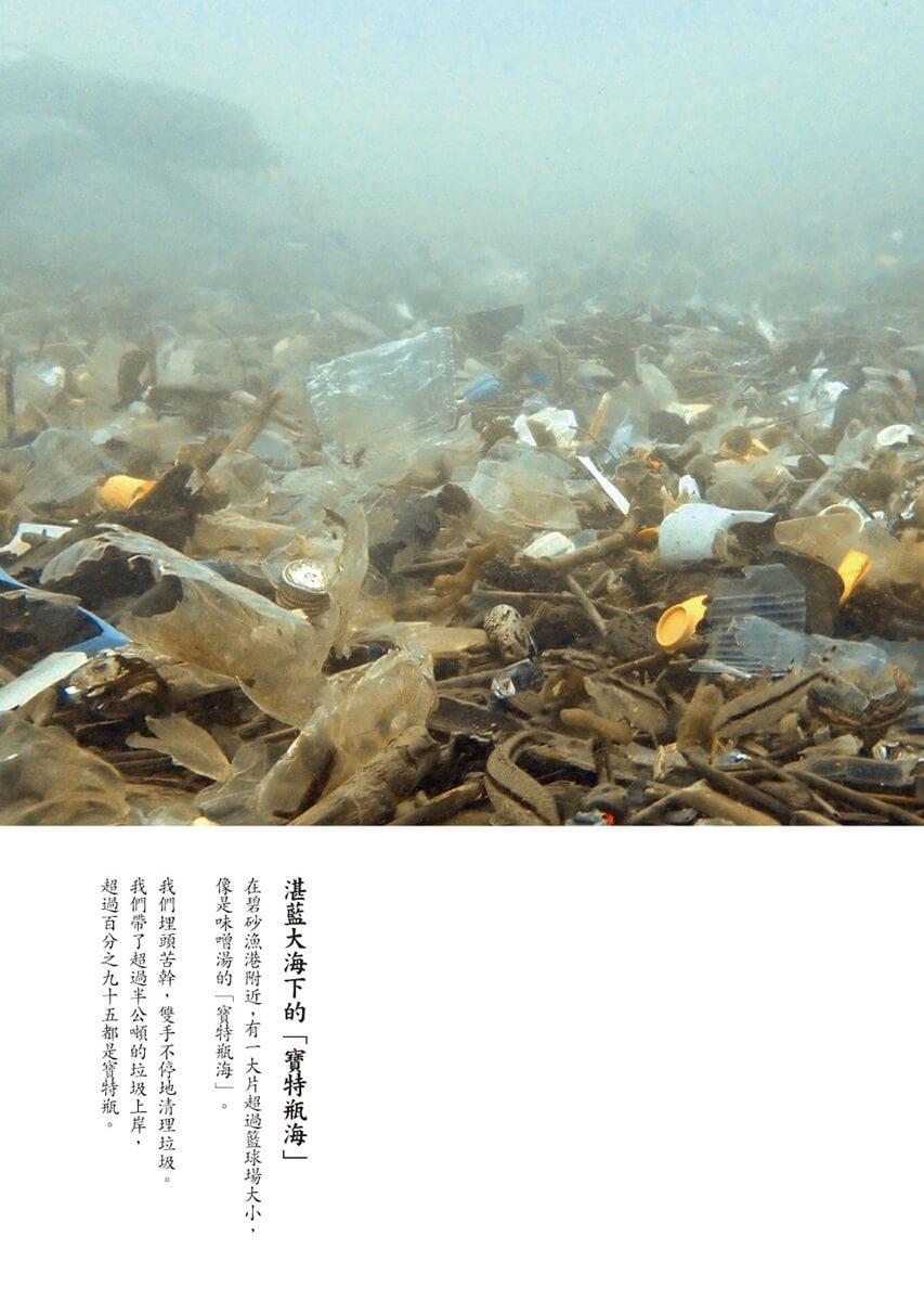 不知是否因為拍攝山林的印象深植人心,每當我身著潛水裝,背著水肺、水底攝影裝備,準備下潛時,經常會遇到觀眾一臉疑問地望著我,說:「麥哥,你跑錯地方了……」如果真要說「越界」,是因為向來希望透過影像,將山海之「美」的真實現況傳達給觀眾的我,卻在幾次浮潛拍攝淨港的過程裡,被蔚藍的水色下,味噌湯一樣的「寶特瓶海」驚嚇到,而陳徵蔚老師就是幾位令人尊敬的潛水教練中,帶著我親身經歷了這些震撼場景的其中一位。