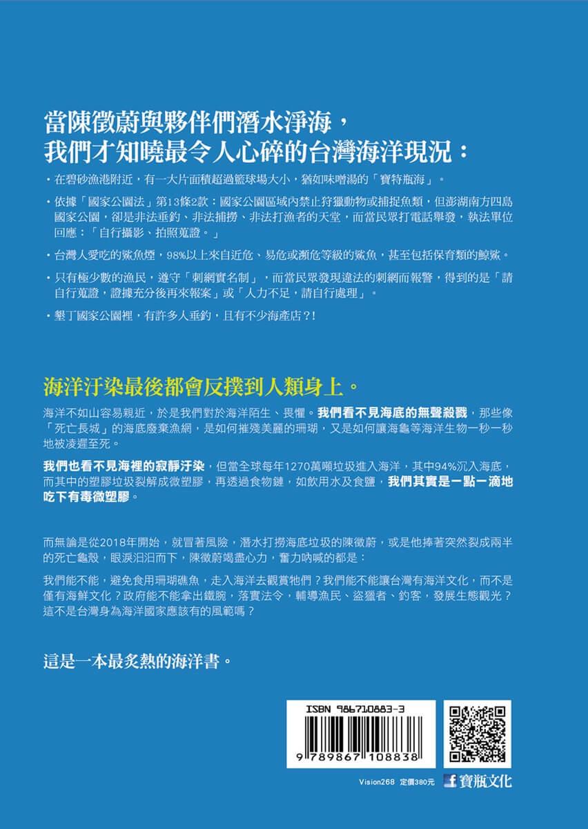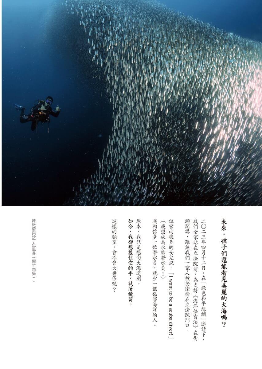這種「多數的沉默」現況,讓他不僅要振臂疾呼,還要進校園對孩子們說、帶學生們去到現場淨灘、組織淨海團體,讓更多人潛下海去、走上街頭為法令陳情抗議。這些因為愛而奮起行動、一刻不容遲疑的魄力,充滿了感染力,也令人動容。──摘自張卉君推薦序〈「成為」海人,不要被打敗〉