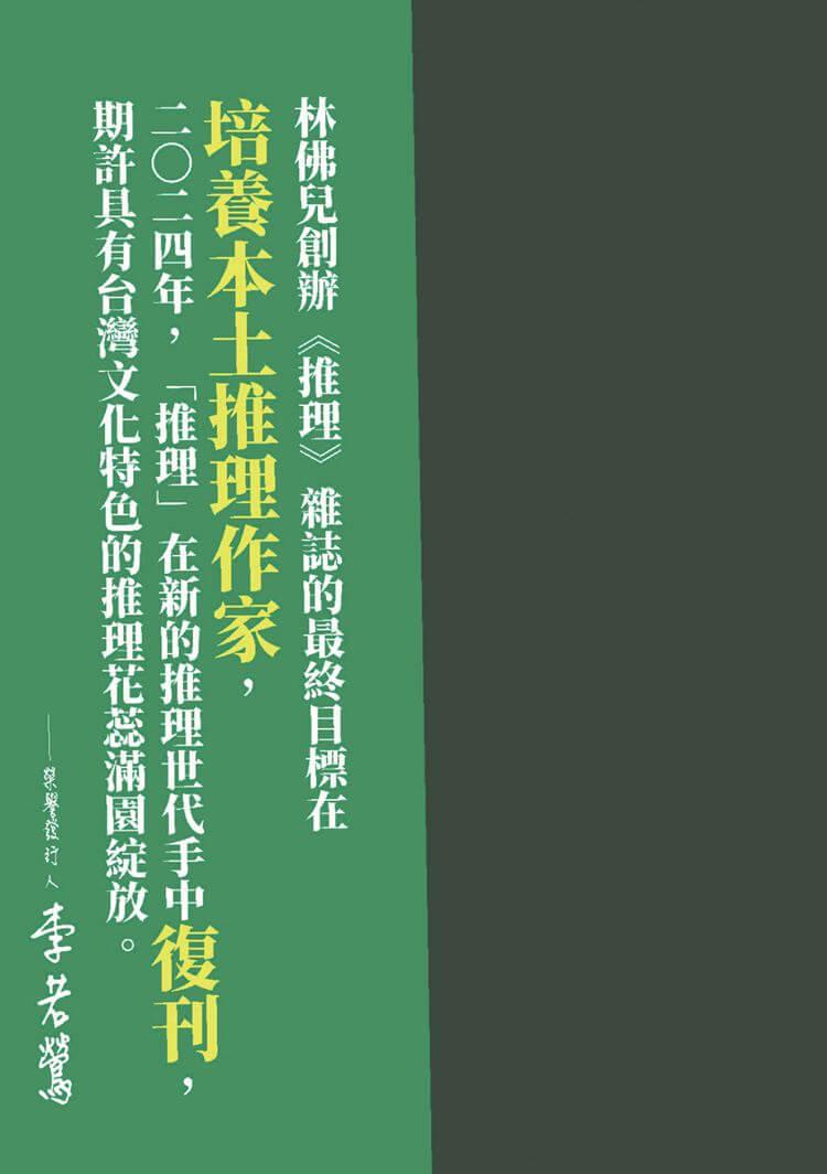 《推理》雜誌長期作為本土作家發表創作的重要園地,在漫長的空白後,如何通過新世代的視角與對類型文學更寬廣的定義、詮釋,接續起犯罪推理在台灣的本土化發展?2025年重返每月一期發行!令人引頸期待!