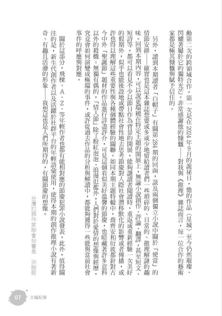 另外,讀到本期讀者「白帽子」有關第284期的回函,談及兩個獨立小說中關於「便當」的情節安排――確實也是這本雜誌想要或多或少地留給讀者們一些瑣碎的、日常的、推理解謎的趣味。回到本期內容,可以說更環繞在特定主題的開展上,無論小說創作、評論、翻譯,甚至短文、短詩等,都可以看見不少以節日作為背景的開展,能夠讓讀者閱讀時,重返或重新經驗一次美好的假期外,似乎也能後設地或帶點社會性地去思考節慶對人際社會潛移默化的影響或者傳播,或許也得以理解這些重要性與各種個體經驗的關聯。如同本期主題特輯中,喬齊安與衍波針對古今中外「聖誕節」題材的作品進行詳盡評介,可見這個看似美好溫馨的節慶,其實也暗藏著許多意料以外的殺機;無獨有偶的,「情人節」除了粉紅泡泡、浪漫氾濫外,人們對於愛情的想像與經歷,究竟會如何演變成極端的事件,或許從過去作品的分析與解讀中,都能夠獲得一些能與當前社會事件的呼應與對應。