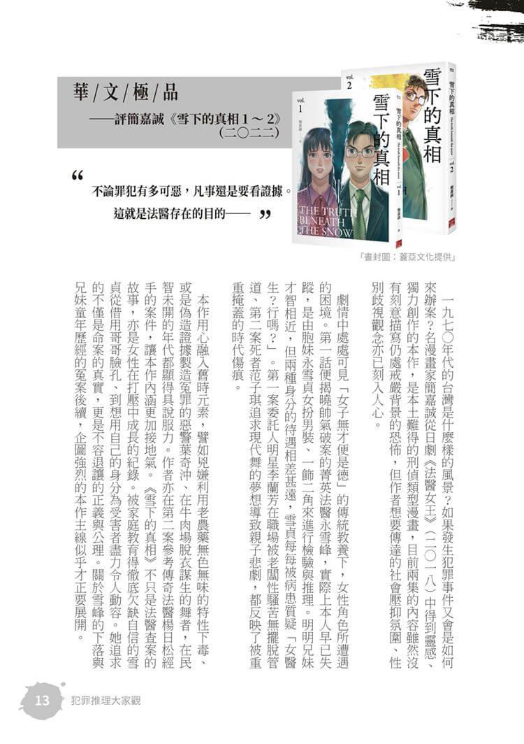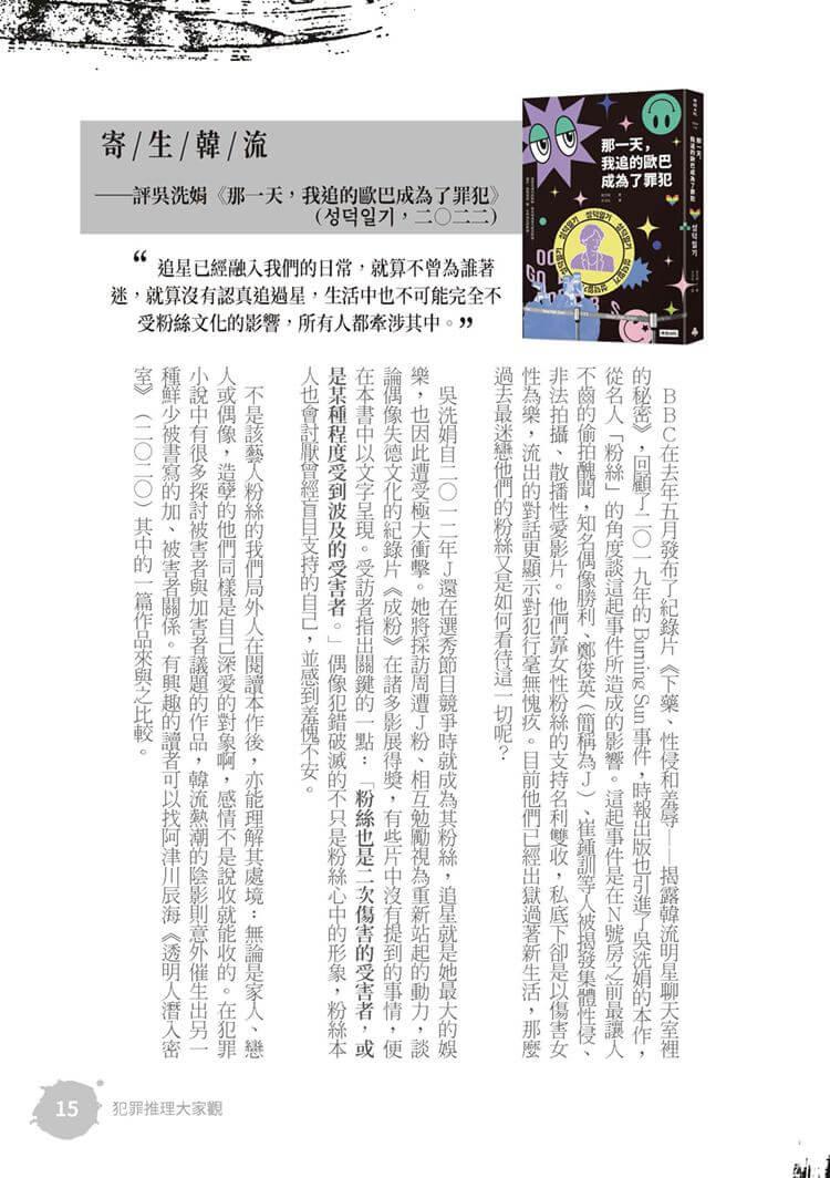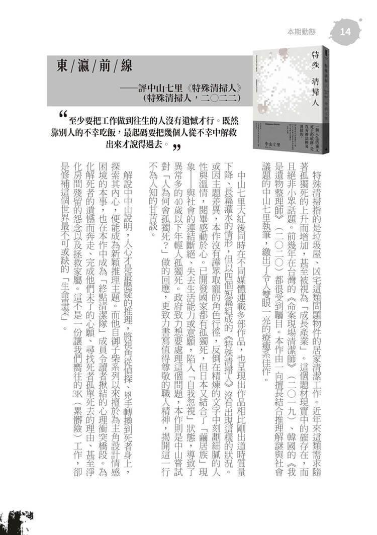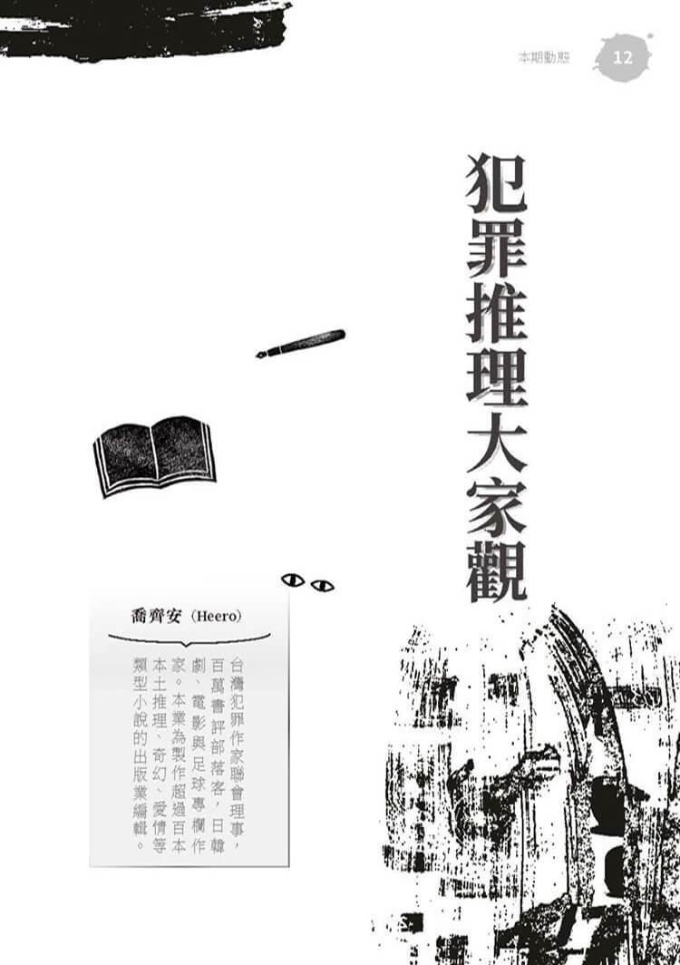 特別收錄田羽心〈魔鬼最厲害的詭計,就是說服全世界相信他並不存在——《焚身少女》〉一文,觀看特殊祭典中的儀式,是否也是一種恐怖的慶祝?;致敬「推理小說大家看」的「犯罪推理大家觀」每期針對華文;日本、韓國的犯罪創作小說評介仍持續刊載,犯罪小說迷絕對不容錯過。