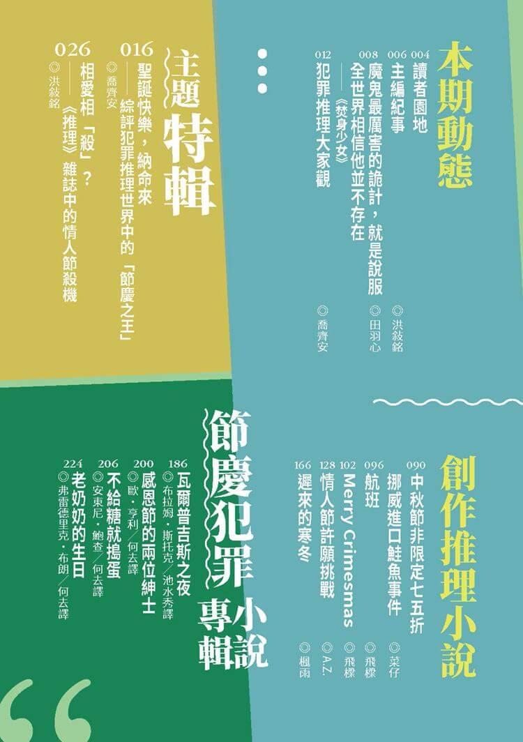 〈聖誕快樂,納命來——綜評犯罪推理世界中的「節慶之王」〉,由喬齊安彙整古今中外的幾部知名的聖誕節犯罪小說,分析節慶在小說中具有的獨特意義與關鍵作用。