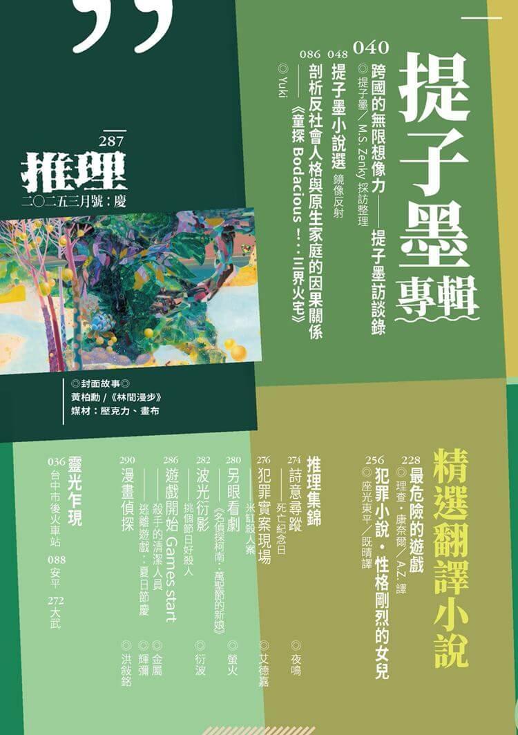 這同時也是我初見本期封面藝術家黃柏勳的作品〈林間漫步〉的感受――我們始終必須窮盡所有,才能在不經意間,保存或保留這些繁複絢爛的色彩,然後用各種形式記憶它們。這是我和柏勳第二次的跨領域合作,第一次是在2024 年9月的詭祕日,他的作品〈星城〉至今仍然璀璨、閃耀著屬於它的獨特光芒。非常感謝他的慷慨――對我與《推理》雜誌而言,每一位合作的藝術家都是極其慷慨與賦予信任的。
