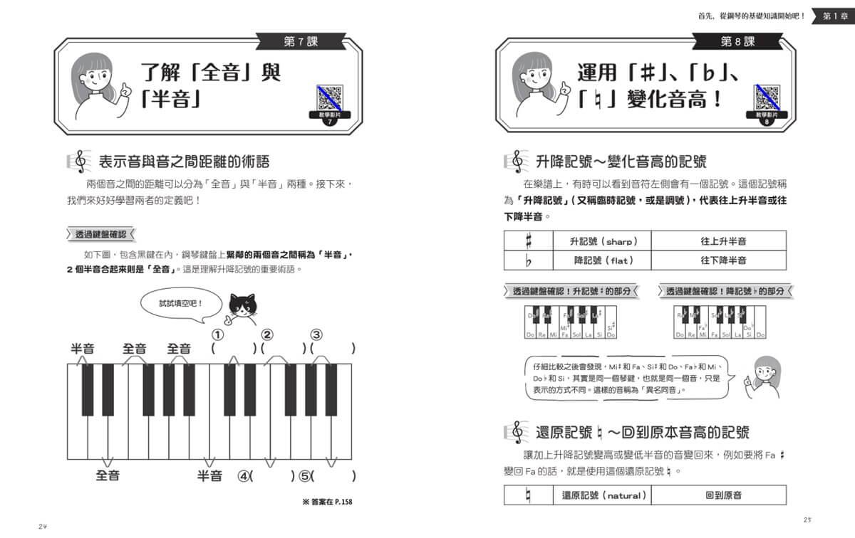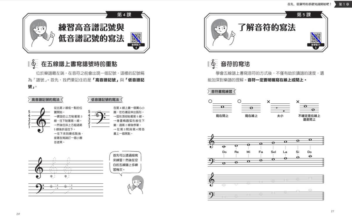 書中影片與文字說明雙管齊下,很適合鋼琴初學者在家自學,也是極佳的教科書,可以輔助鋼琴老師準備教材授課,非常實用。另外,書籍第6、7、8章是以術語、樂曲彈奏和辨別調性為主,是已有基礎的中階者繼續學習的好課本。