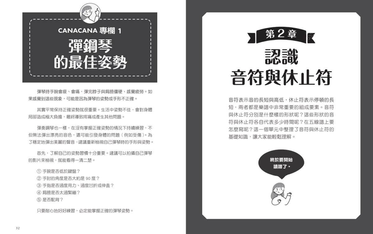 本書由專業鋼琴YouTuber,指導過各年齡段學生,擁有豐富現場教學經驗的名師CANACANA親自設計,一共56堂課。課程主題循序漸進,從最基礎的音符、音階、拍號、手形、指法和讀譜、彈奏,到中階的調性、調號、和弦和術語等,完整有系統。每課內容除了文字解說,都附有詳細的QR Code影片教學,適合新手自學。CANACANA更用心製作每一課的教學影片,她在影片中特別做延伸教學,更深入講解,讓讀者可以透過影片學到比書籍更多的知識,以及技巧。