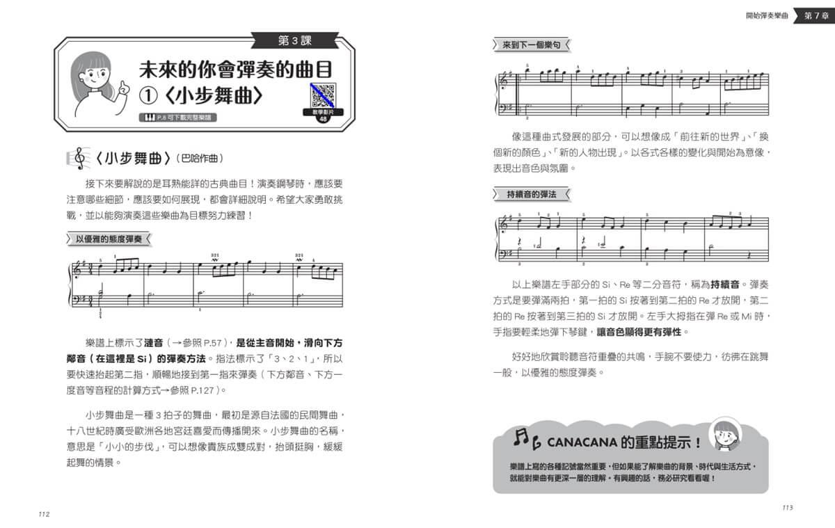 除了這56堂基本工課程,CANACANA還提供了〈洋娃娃之夢〉、〈阿拉貝斯克〉、〈小步舞曲〉和〈小狗進行曲〉等經典曲目的樂譜,可以透過書中QR Code下載,輕鬆使用。