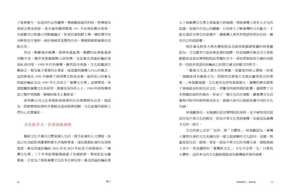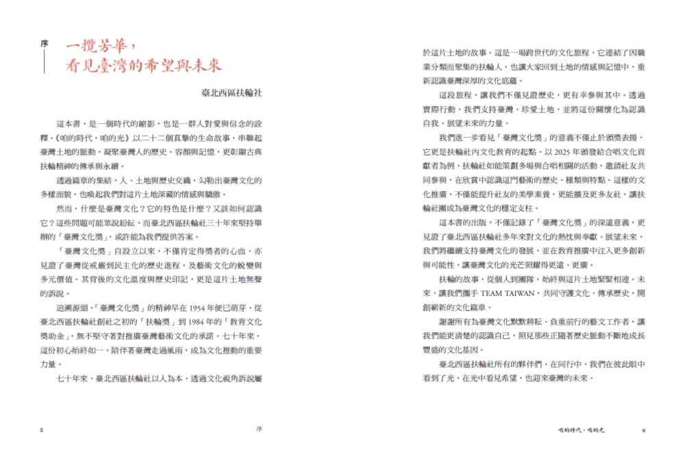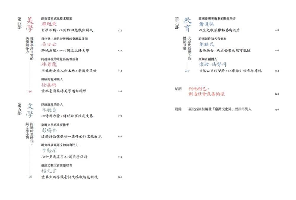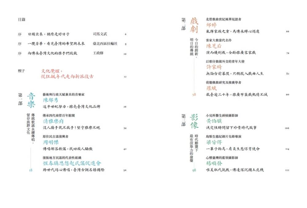 這些文化工作者的堅持與努力,讓臺灣文化能隨著時代演進,持續豐美、永續傳承,期待透過本書每一篇得獎人的故事,喚醒新世代對傳統文化的重視,並在傳統的基礎上創新未來。