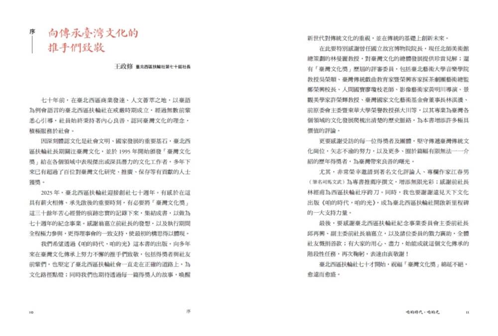 藝術文化不僅可以豐富個人生活,提升社會的人文價值,長此以往也能對周遭事物產生共鳴與尊重,進而推動社會的包容與溫度。臺北西區扶輪社2024年至2025年社長王政修指出,「臺灣文化獎」三十年來給獎範圍涵蓋了各個族群,獎項更是包羅萬象,正是為了展現臺灣文化的多元與包容;臺北西區扶輪社第七十屆臺灣文化獎主委翁嘉立則強調,增進臺灣人對本土文化的認識,是提升自信心的關鍵。只有深入了解臺灣的文化魅力,才能在當前全球化的浪潮中,讓臺灣人與世界對話時更加自信,擁有自己的話語權。
